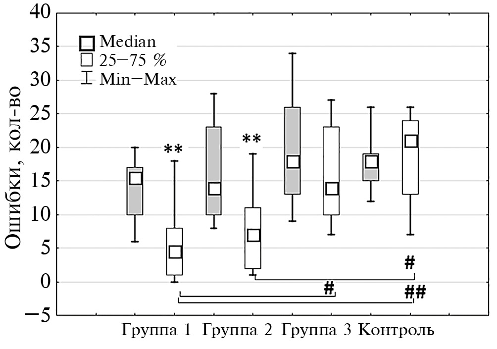 Рис. 3. Количество ошибок во время прохождения "Лабиринта" в группах до и после эксперимента (медиана ± 25–75% ± минимальное и максимальное значение). Серые прямоугольники — до, белые прямоугольники — после эксперимента. Группа 1 – "Координация", группа 2 – "Сочетанная", группа 3 – "Силовое расслабление".