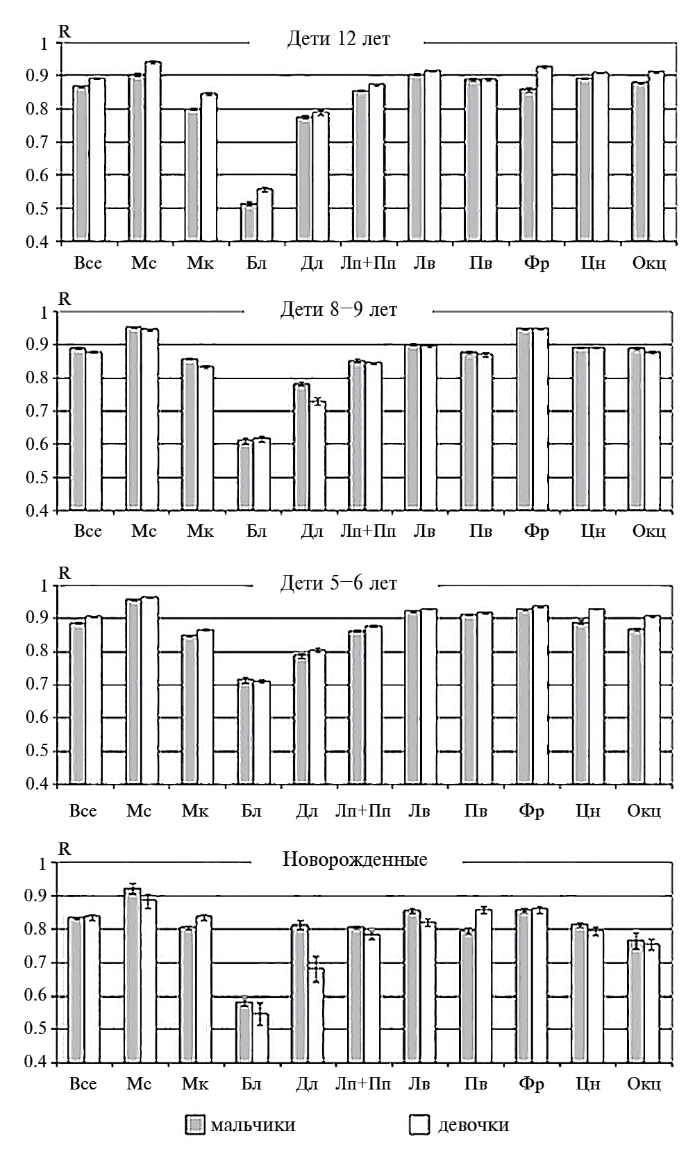 Рис. 2. Средние величины коэффициентов межиндивидуального сходства пространственных структур дистантных взаимосвязей ЭЭГ в группах мальчиков (серые столбики) и в группах девочек (белые столбики) разного возраста, оцениваемые в 11 выделенных комбинациях связей ЭЭГ. Доверительные интервалы оценивались по t-критерию Стьюдента с применением z-преобразования Фишера, при p = 0.05. Обозначения структур см. рис. 1.