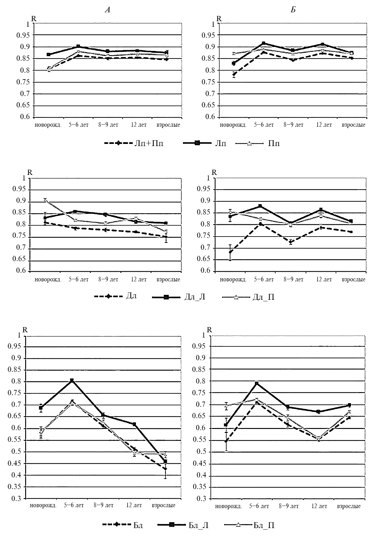 Рис. 5. Возрастная динамика коэффициентов межиндивидуального сходства пространственных структур дистантных взаимосвязей ЭЭГ в группах лиц мужского пола (черная линия) и в лиц женского пола (серая линия) разного возраста, оцениваемых в каждом из полушарий в отдельности в трех основных («Лп+Пп», «Дл» и «Бл») и шести дополнительных комбинациях связей ЭЭГ («Лп», «Пп», «Дл_Л», «Дл_П», «Бл_Л», «Бл_П»). А – данные по лицам мужского пола, Б – данные по лицам женского пола.
