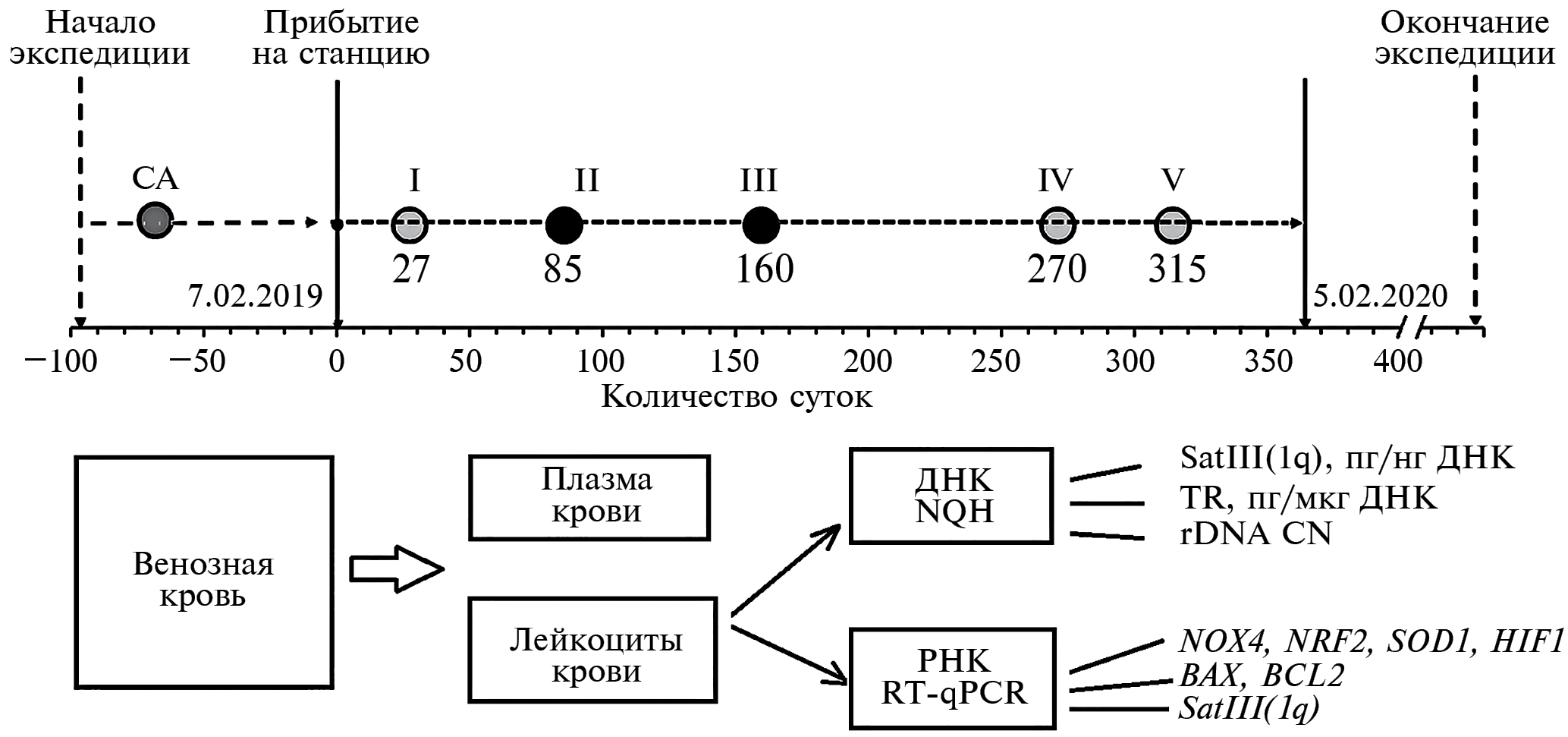 Врачом экспедиции были взяты образцы крови у всех участников. Проба СА – кровь брали до прибытия на станцию (контрольная проба). Пробы I–V – кровь брали в различные периоды пребывания людей на станции. Пробы I (06.03.2019), IV (05.11.2019) и V (18.12.2019) позволяют проанализировать ответ организма на функционирование в условиях полярного дня. Пробы II (03.05.2019) и III (16.07.2019) – ответ на функционирование организма в условиях полярной ночи.
