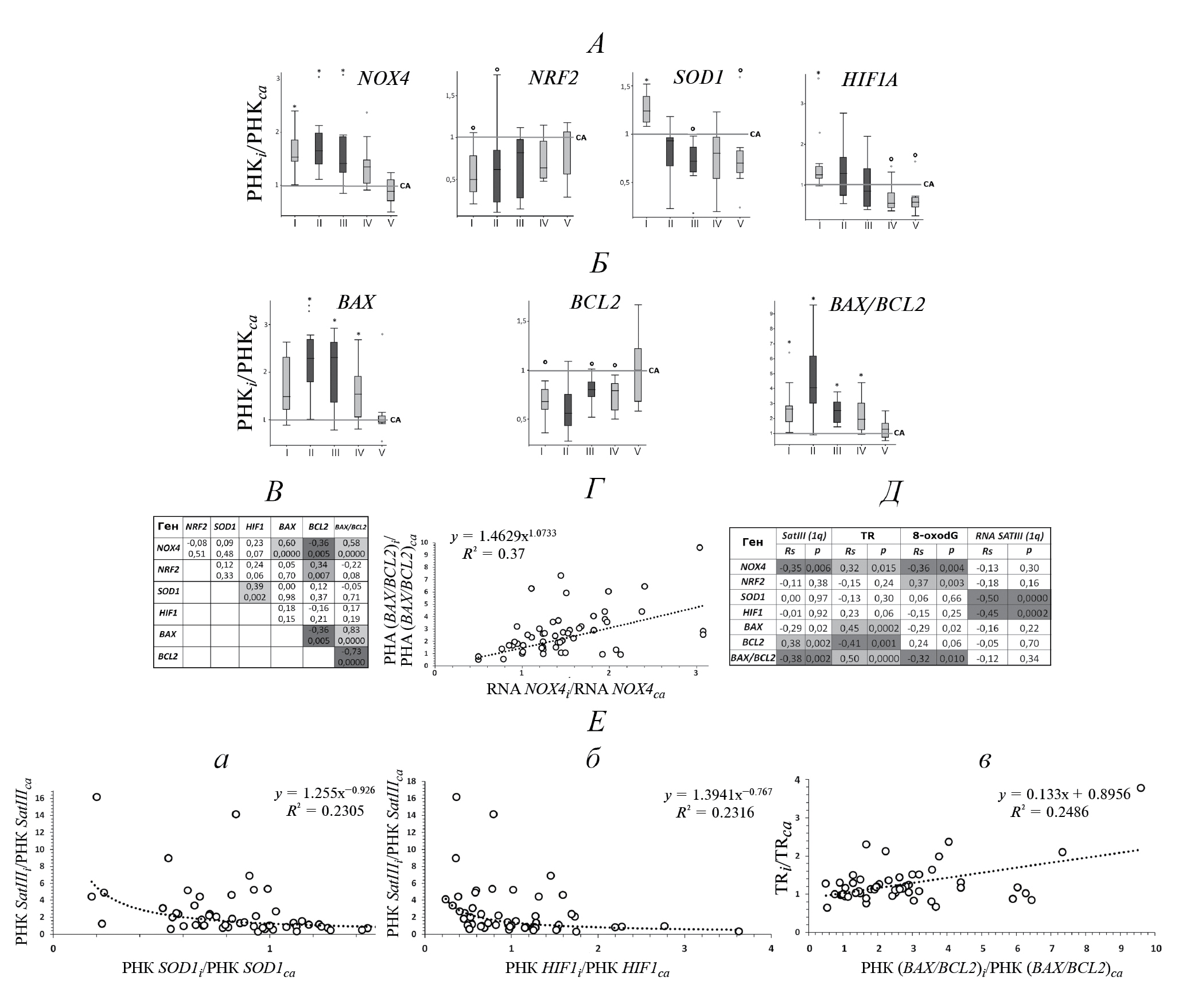 Рис. 4. Изменения в уровне РНК генов, контролирующих уровень окислительного стресса и гибель клеток. А – изменения в количестве РНК генов NOX4, NRF2 (NFE2L2), SOD1 и HIF1A, регулирующих уровень АФК в клетках, в точках I–V по сравнению с контролем (см. табл. 1). Б – изменения в количестве РНК генов BAX, BCL2, регулирующих апоптоз в клетках, и отношения РНК(BAX/BCL2) в точках I–V по сравнению с контролем (см. табл. 2). В – корреляционный анализ (по Спирмену) связей между изменениями анализируемых в работе генов. Г – зависимость изменений отношения РНК(BAX/BCL2) от изменений RNA NOX4. Д – корреляционный анализ связей между параметрами ДНК и РНК SATIII(1q), выделенных из клеток, и изменениями в количестве РНК анализируемых в работе генов. Е – анализ корреляций между изменениями в уровне РНК SATIII(1q) и изменениями в уровне РНКSOD1 (а) и РНК HIF1 (б), зависимость изменений в содержании TR от показателя, отражающего уровень апоптоза (в).