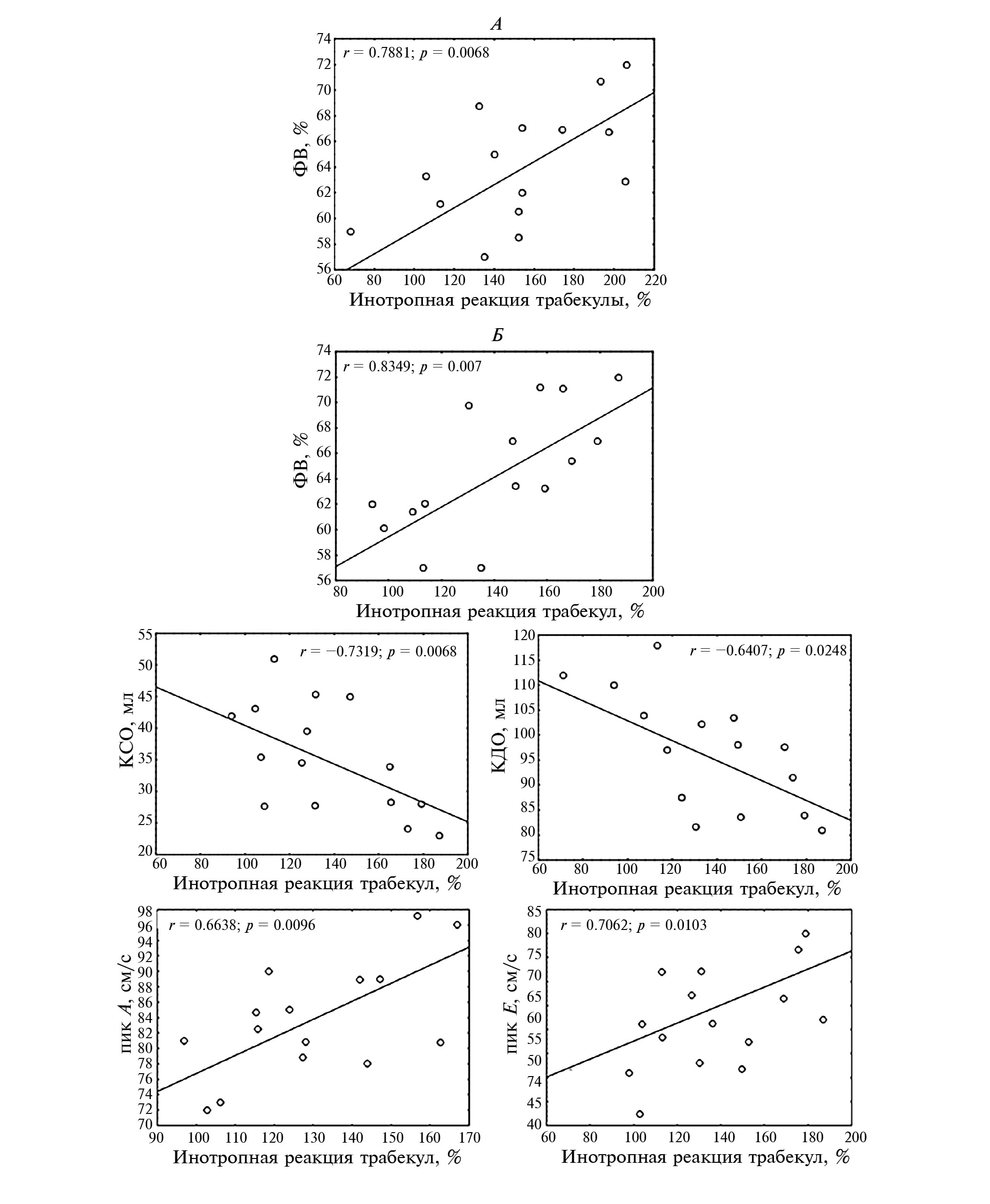 Рис. 3. Корреляционные связи, обнаруженные у пациентов с низкой ФВ, между инотропным ответом мышечных полосок через 1 (А) и через 20 (Б) мин после стимуляции β1-АР с результатами эхокардиографии (ЭхоКГ) исследования их сердца. Обозначения см. рис. 2