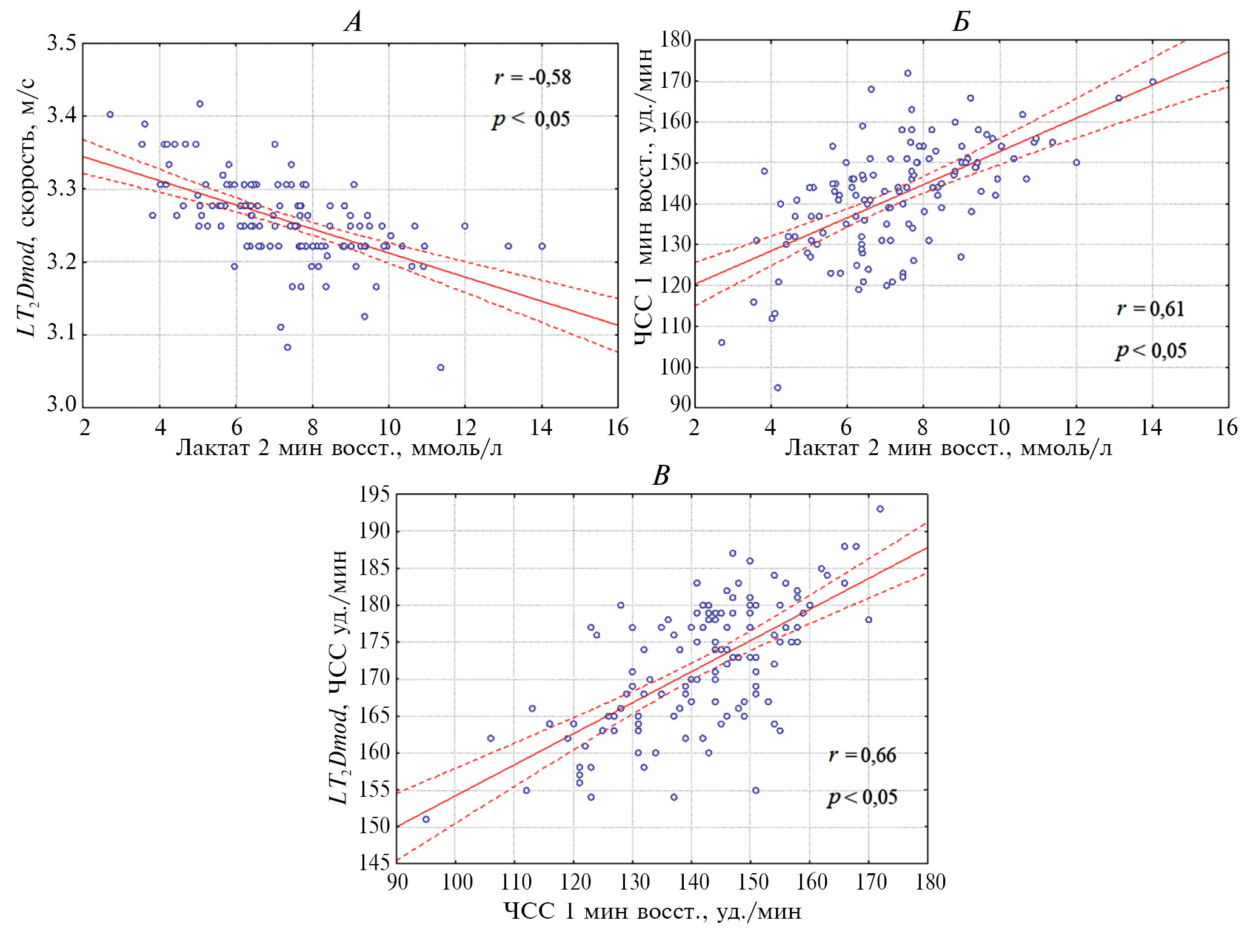 Рис. 3. Взаимосвязь между скоростью LT2 Dmod и лактатом на 2-й мин восстановления (А), частотой сердечных сокращений (ЧСС) на 1-й мин восстановления и лактатом на 2-й мин восстановления (Б); ЧСС LT2 Dmod и ЧСС на 1 мин восстановления (В)