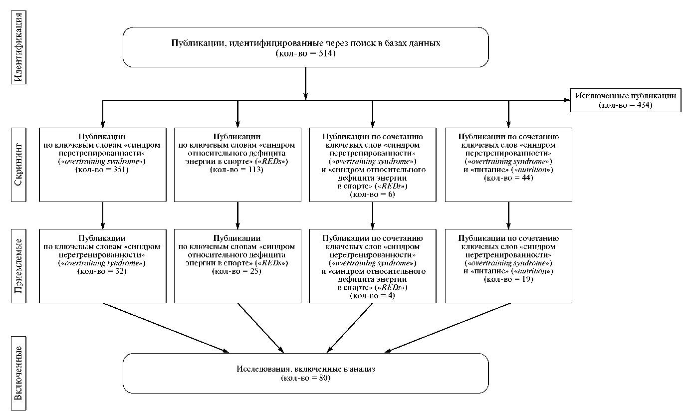 Отбор и анализ публикаций осуществлялся по тематике СП, REDs, по связи данных синдромов, а также вопросам нарушения доступности энергии и пищевых веществ при СП. Поиск литературы производился по двум литературным базам (PubMed и Elibrary.ru). Отбор работ для анализа осуществлялся из 514 статей двух литературных баз по четырем темам: