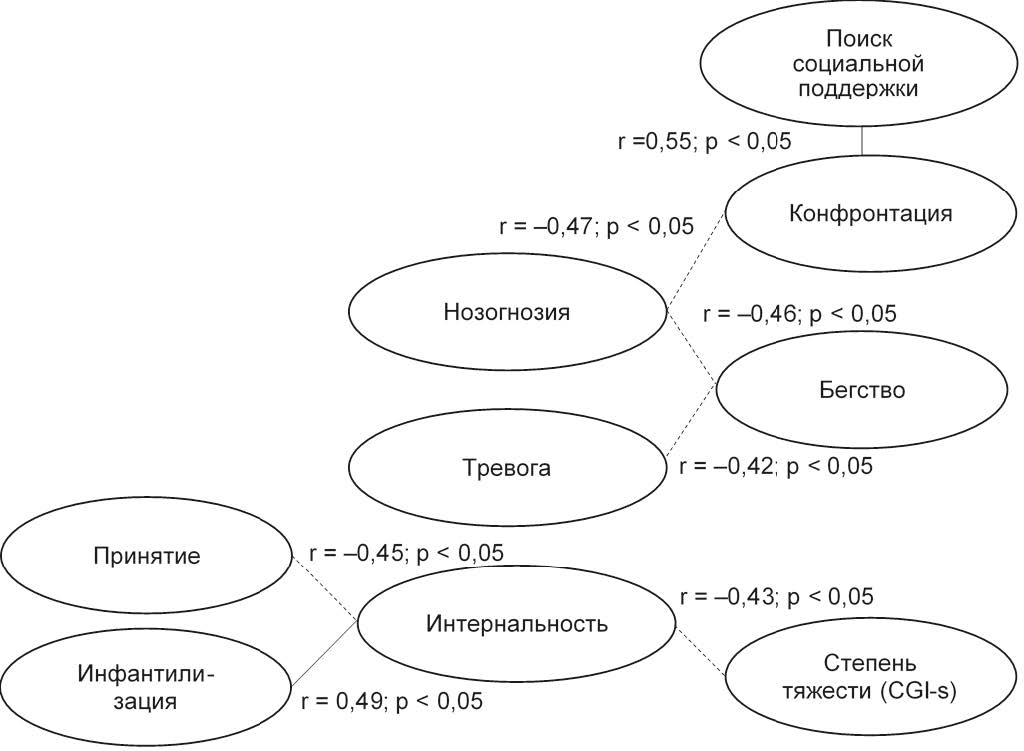 Обнаруживается положительная связь между шкалой конфронтации и шкалой поиска социальной поддержки (r = 0,55; p < 0,05), это свидетельствует о том, что в процессе поиска возможных вариантов помощи, «борьбы» за ребенка, родители ориентированы на взаимодействие с другими людьми, они находятся в поиске внимания, совета, понимания.