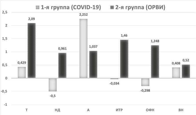 Большинство испытуемых из первой выборки, перенесших COVID-19, характеризуется тревожным (22 %) и неврастеническим (14 %) типами отношения к болезни с демонстрацией недоверия к методам лечения, а также выражением опасения за существующую вероятность неблагоприятного исхода заболевания и его последствий. Для большинства представителей второй выборки, перенесших ОРВИ, был характерен анозогнозический тип отношения к болезни (45 %). Это проявлялось отбрасыванием мыслей о возможных последствиях болезни и несерьезным отношением к своему состоянию. В целом пациенты с диагнозом COVID-19 характеризуются более тревожным отношением к своей болезни, чем пациенты, перенесшие ОРВИ, поскольку для последних поставленный диагноз не носил фатального характера.