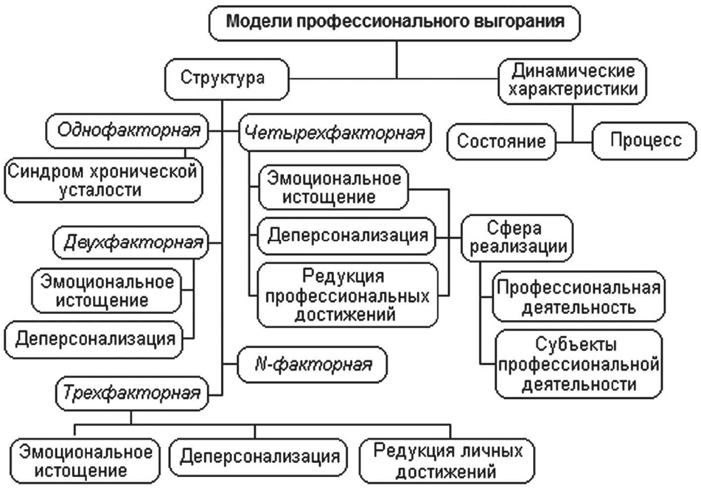 Обобщенные методологические аспекты оценки ПВ показаны на схеме (рис. 1). Наиболее распространенной является 3-факторная модель ПВ, научно-обоснованная C. Maslach и соавт. [11]. ПВ рассматривается в совокупности выраженности трех составляющих: 1) эмоциональное истощение; 2) деперсонализация; 3) редукция личных достижений.