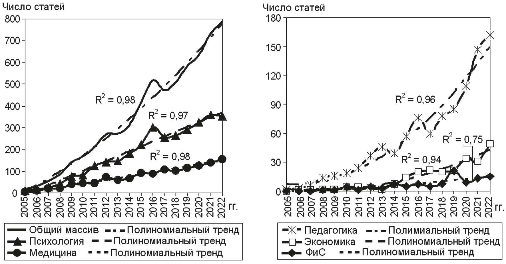 Общие данные. Проанализировали массив из 6219 отечественных научных статей по ПВ, проиндексированных в РИНЦ с 2005 по 2022 г. Динамика статей показана на рис. 4. Полиномиальные тренды общего массива и статей по направлениям научных исследований при очень высоких коэффициентах детерминации демонстрировали увеличение данных.