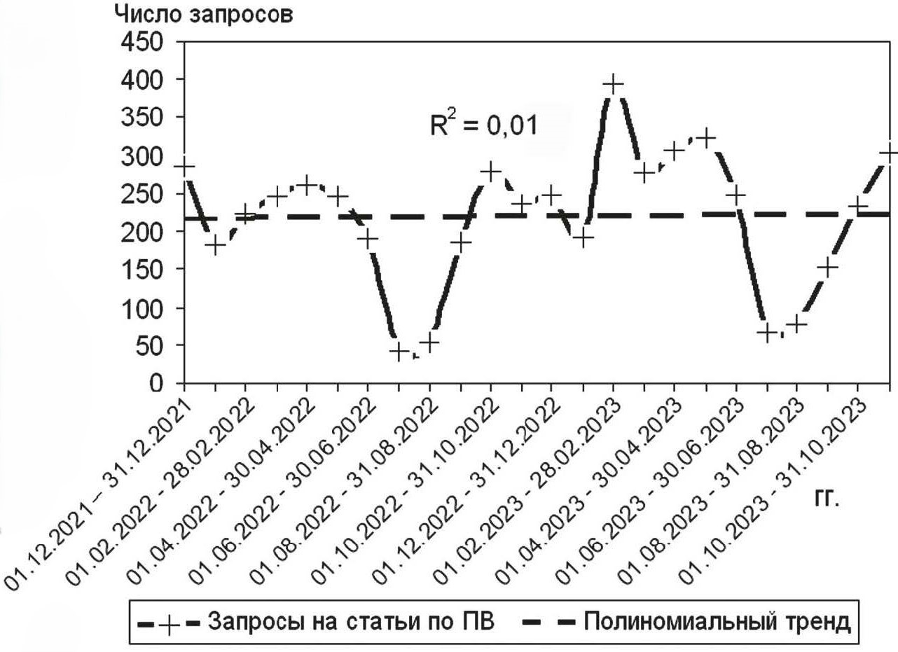 Изучили ежемесячную частоту запросов пользователей на статьи по ПВ, диагностике ПВ, лечению ПВ в поисковой системе Вордстат, предоставляемой компанией Яндекс, за последние 2 года. Получили данные о том, сколько раз определенные фразы были введены в поисковую строку за определенный период времени. Убедительных данных о динамике всех запросов на поисковые слова не получили. Например, полиномиальный тренд запросов пользователей на статьи по ПВ при очень низком коэффициенте детерминации напоминал горизонтальную линию, то есть отмечался недостоверный стабильный интерес (рис. 6), однако, на рис. 4 показано явное увеличение числа статей по ПВ.