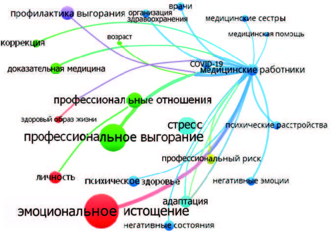 Кластерный анализ ключевых слов показал явно выраженное изложение профессионального выгорания в статьях с позиций профилактики и реабилитации. 1-й кластер объединял ключевые слова по эмоциональному истощению и факторам его предупреждающим в 36,3 % статей с 32,8 % общей силой связи, 2-й кластер – по профессиональному выгоранию и факторам его предупреждающим – в 29,1 и 28,3 %, 3-й кластер – по формированию последствий профессионального выгорания у медицинских работников – в 10,7 и 11,9 %, 4-й кластер – по влиянию стресса на формирование не только профессионального выгорания, но и на повышение стрессоустойчивости и адаптивности – в 8,5 и 9,7 %, 5-й кластер – по редукции личных достижений, деперсонализации и деформации личности – в 6,3 и 7,6 %, 6-й кластер – по профилактике профессионального выгорания – в 6,8 и 7,4 %, 7-й кластер – по вероятности развития профессионального истощения и профессионального выгорания у специалистов экстремальных профессий – в 2,3 и 2,4 % соответственно.