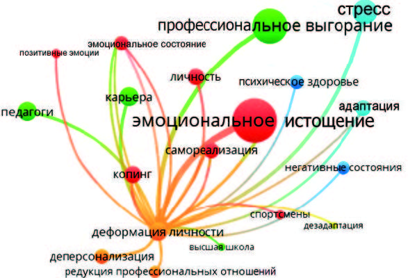 В статьях выявлены высокие взаимоотношения ведущих обобщенных ключевых слов в кластерах, например, самый выраженный термин – эмоциональное истощение – встречался со словосочетанием профессиональное выгорание в 504 статьях, с ключевым словом стресс – в 485 статьях, со словосочетанием профессиональные отношения – в 289, деформация личности – в 263, деперсонализация – в 223, профилактика выгорания – в 240, педагоги – в 293, медицинские работники – в 135 статьях и т.д. (рис. 11).