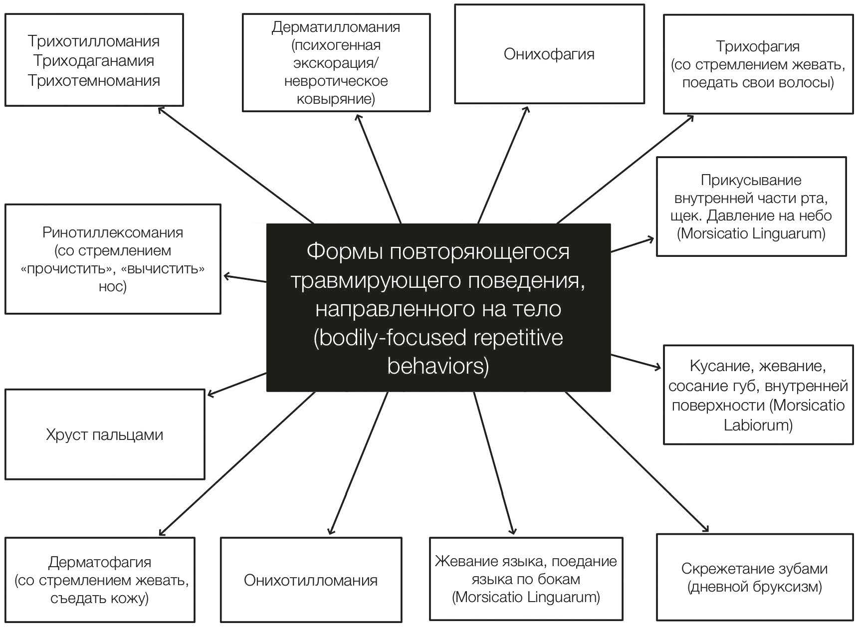 Рис. 1. Спектр клинических проявлений повторяющегося травмирующего поведения, направленного (сфокусированного) на тело