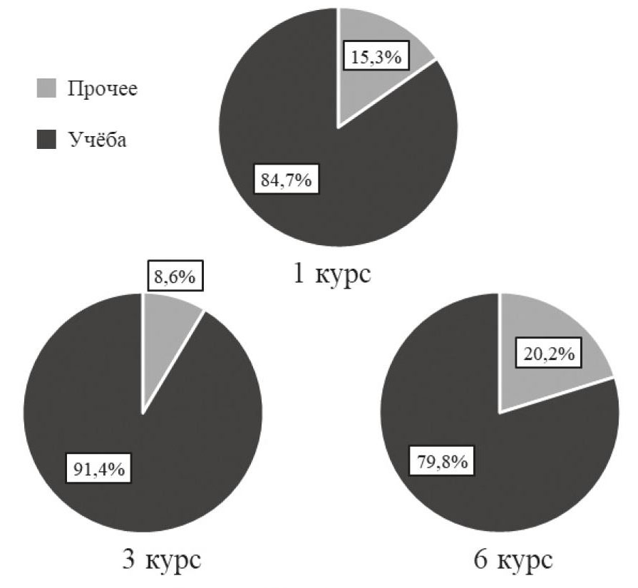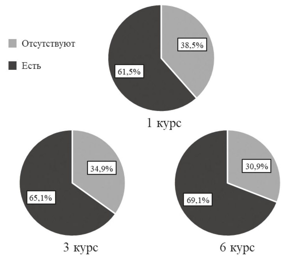 На сегодняшний день одним из лидирующих по факторам стресса видом профессиональной деятельности является врачебная. Специалисты медицинского профиля сталкиваются с трудностями еще на этапе обучения, что сказывается на их психологическом состоянии. На 1-м курсе студенты испытывают положительные эмоции, связанные с поступлением их в университет, однако со временем большинство студентов сталкиваются с новыми для них трудностями, что вызывает ряд психологических проблем. Уже к концу 6-го курса у студентов появляются элементы синдрома эмоционального выгорания, о чем свидетельствует пониженная работоспособность, а также рост числа вредных привычек [11]. К старшим курсам добавляются проблемы иного характера и происходит переключение внимания на другие проблемы.