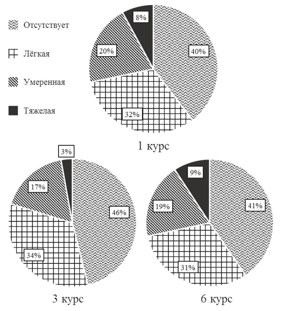 На протяжении всего процесса обучения наиболее актуальным стрессом студентовмедиков является учебная нагрузка. Наличие вредных привычек не зависит от курса (p > 0,05). Исходя из данных стресс-теста В.Ю. Щербатых у студентов 1-го, 3-го и 6-го курса наиболее выраженными стали 3-я и 4-я стадии стресса. В основном у всех студентов отмечалась поведенческая стратегия «оптимизм во всех ситуациях, включая неопределенные». Второй по встречаемости стратегией стала целеустремленность в разрешении возникших проблем. У 37,83 % студентов на 1-м курсе, 38,16 % на 3-м курсе и 43,66 % на 6-м курсе не отмечалась выраженная тревога. При статистическом анализе частоты встречаемости клинически и субклинически выраженной тревоги статистически значимых различий между курсами не обнаружено (p > 0,05).