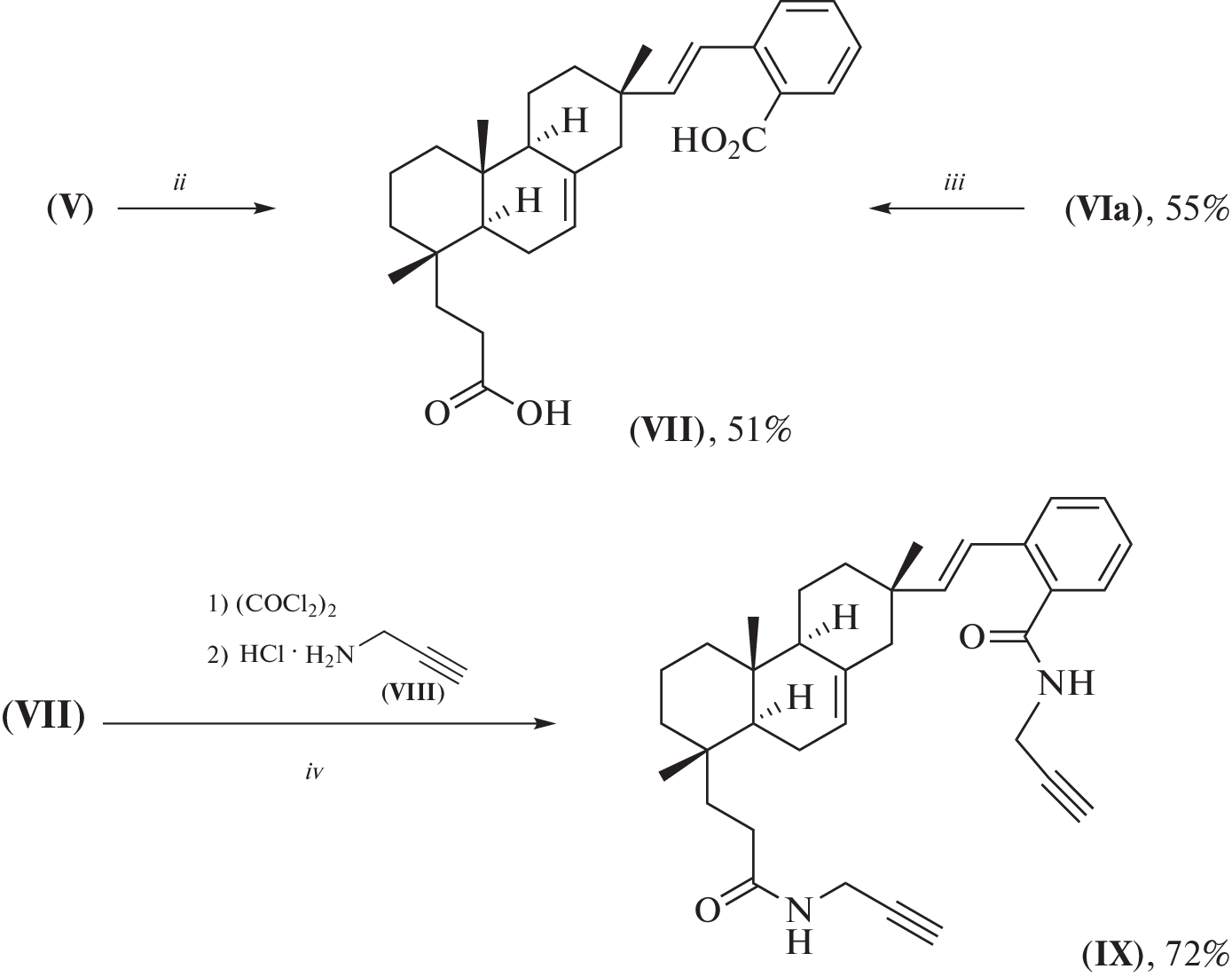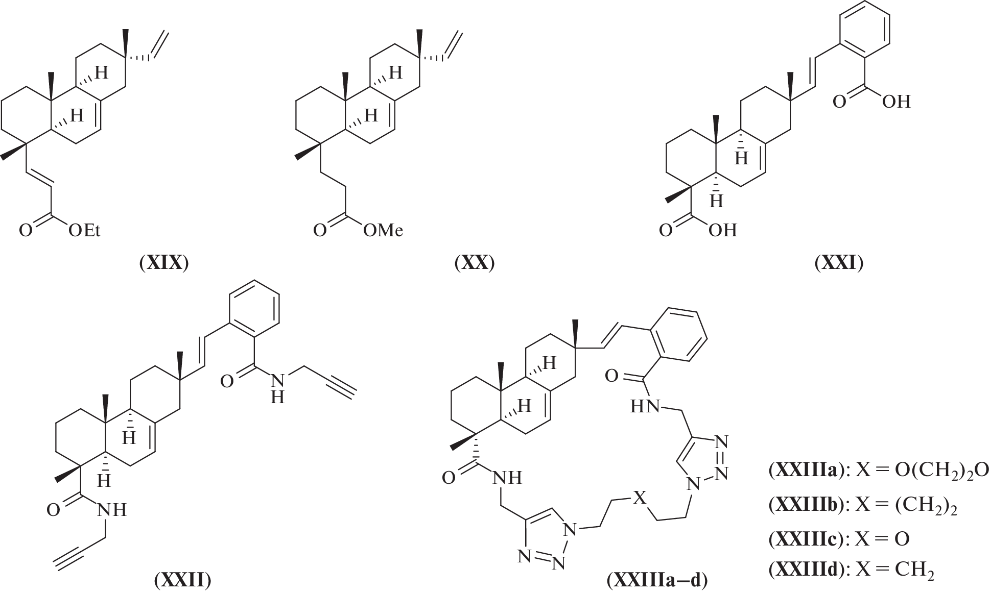 (E)-16-Aryl-substituted derivatives of tricyclic diterpenoids were synthesized by cross-coupling of isopimaric acid derivatives with substituted iodorenes catalyzed by palladium acetate in the presence of silver carbonate. Condensation of (E)-18-nor-4-(carboxyethyl)-16-(2-carboxyethyl)isopimar-7,15-diene dichloride with propargylamine hydrochloride leads to the corresponding dialkine, which readily reacts with diazide in the Cu(I) catalyzed cycloaddition (CuAAC) reaction, with the formation of macroheterocyclic compound containing a pimaran type tricyclic diterpenoid core and 1,2,3-triazole rings in the linker chain. Reaction of in situ prepared (E)-18-nor-16-azido-4-(carboxyethyl)isopimar-7,15-diene acid chloride with propargylamine hydrochloride or an alkynyl-substituted derivative of the protected Gly-Gly dipeptide leads to the corresponding azidoalkynes. The intramolecular CuAAC reaction of azidodipeptidylalkine afforded a macroheterocyclic derivative containing a dipeptide and triazole moiety in the linker chain. The obtained compounds showed higher (compared with the isopimaric acid) cytotoxicity on tumor cells MCF-7 and were less toxic to non-cancer cells than the reference drug doxorubicin. The GI50 value of the most active compound is 6.3 μM, selectivity index >15) (MTT test). The synthesized derivatives of the tricyclic diterpenoid isopimaric acid can be used to develop new antitumor agents.