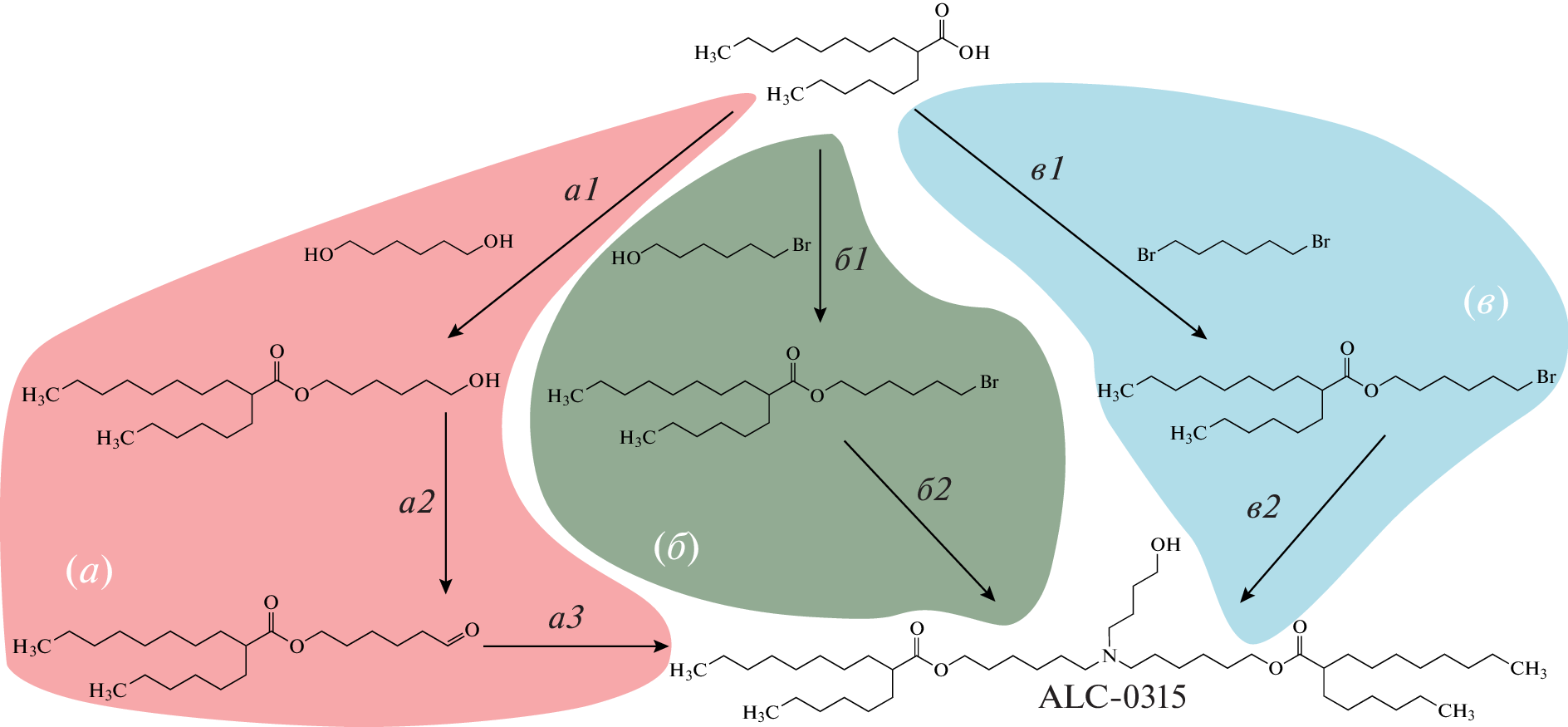 Ionizable lipid ALC-0315 – ((4-hydroxybutyl)azanediyl)bis(hexane-6,1-diyl)bis(2-hexyldecanoate) – is a part of the lipid matrix of the mRNA vaccine for the prevention of infection with the SARS-CoV-2 virus manufactured by Pfizer/BioNTech. This lipid provides effective assembly of the vaccine particle, protection of mRNA from premature degradation, and after endocytosis, promotes the release of nucleic acid into the cytoplasm for further processing. In this paper, a simplified and economical method for producing ALC-0315 is proposed, which can be used in the production of mRNA vaccines.