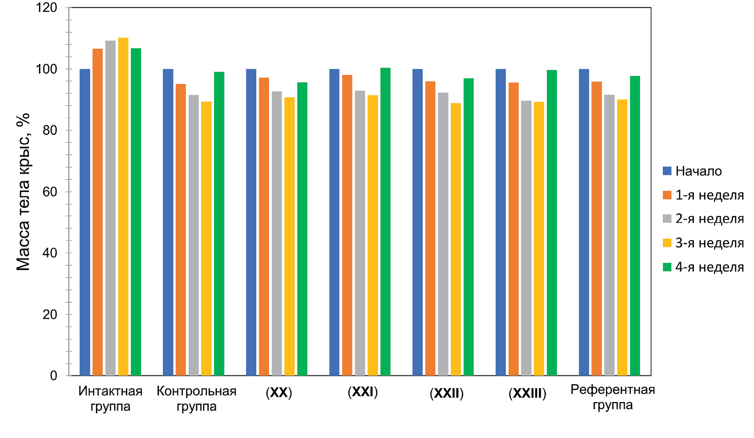 Рис. 3 отражает весь период эксперимента. Первый столбец – средняя начальная масса крыс (принята за 100%). Второй и третий столбцы – двухнедельный этап моделирования СД на первом этапе эксперимента. Два последних столбца – вес животных на этапе фармакокоррекции. Все время эксперимента животные интактной группы продолжали набирать массу тела согласно средним темпам, характерным для данной возрастной категории. Масса тела животных остальных групп на этапе моделирования СД стабильно снижалась. Однако начиная с третьей недели, когда животным было прекращено введение дексаметазона и начата фармакокоррекция соединениями (XX–XXIII) и метформином, масса крыс стала постепенно увеличиваться. Поскольку этот феномен наблюдался и в контрольной группе, вероятно, это связано с отменой дексаметазона. Набор веса наблюдался у животных всех групп, кроме интактной, но только в трех группах масса тела животных не достигла первоначальных значений – это группы, которые получали метформин (97.83%) и соединения (XX) и (XXII) (95.51 и 97.03% соответственно). Этот факт заставляет предположить способность метформина и соединений (XX) и (XXII) уменьшать интенсивность синдрома отмены ГКС. Следует отметить, что согласно данным виртуального скрининга in silico, среди потенциальных мишеней соединений (XX) и (XXII) отмечены рецепторы кортикотропин-рилизинг-гормона 1-го типа (CRHR1). Известно, что ген рецептора CRHR1 вовлечен в регуляцию эндогенного уровня кортикостероидов и может оказывать влияние на ответ на глюкокортикостероиды, назначаемые экзогенно [75, 76].