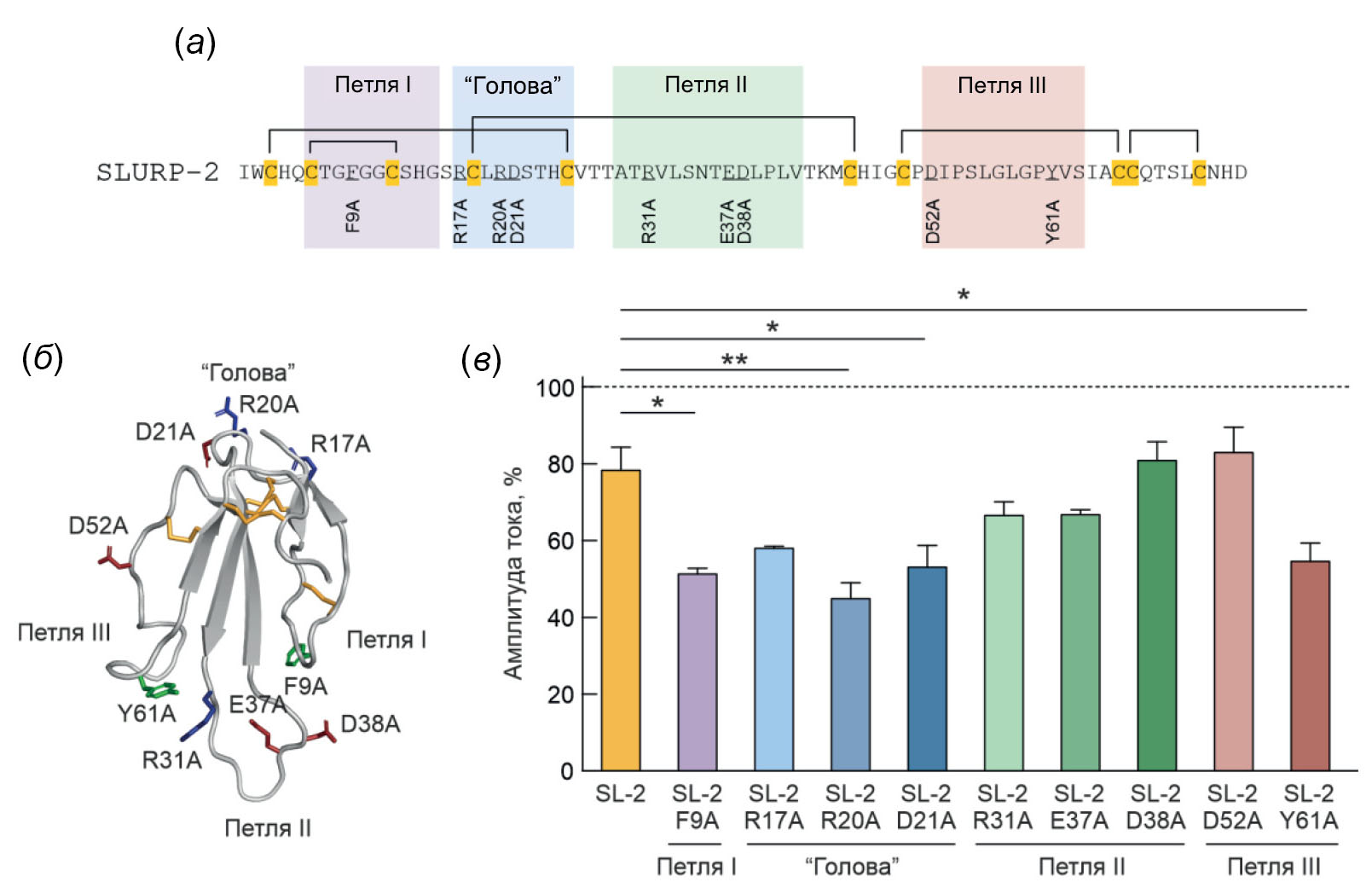 Рис. 2. Влияние SLURP-2 и его мутантов на ацетилхолин-индуцированные токи через каналы α7-nAChR, экспрессированные в ооцитах Xenopus laevis: (а) – аминокислотная последовательность SLURP-2. Остатки цистеина выделены желтым, дисульфидные связи показаны скобками. Мутированные аминокислотные остатки подписаны снизу; (б) – пространственная структура SLURP-2 (PDB: 2n99) с обозначенными на ней остатками, замененными на аланин; (в) – амплитуда токов, вызванных 40 мкМ AСh, в ооцитах Xenopus laevis, экспрессирующих α7-nAChR, в присутствии 1 мкМ SLURP-2 (SL-2) или его мутантов. Данные представлены в процентах от контроля ± стандартная ошибка среднего (n = 3), 100% соответствуют амплитуде тока, вызванного 40 мкМ AСh, в необработанных ооцитах. * p < 0.05 и ** p < 0.01 означают достоверное отличие от группы “SLURP-2” по одностороннему тесту ANOVA с последующим Dunnet’s/hoc-тестом.