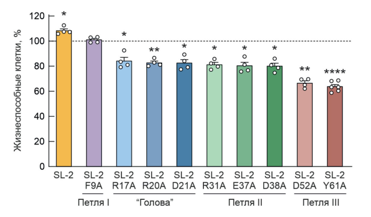 Рис. 3. Влияние SLURP-2 и его мутантов на пролиферацию клеток Het-1A. Клетки инкубировали в течение 48 ч с 1 мкМ SLURP-2 (SL-2) или его мутантов. Число жизнеспособных клеток определяли с помощью WST1-теста. Данные приведены в процентах от контроля ± стандартная ошибка среднего (n = 4–6), 100% жизнеспособных клеток соответствует необработанным клеткам. * p < 0.05, ** p < 0.01 и **** p < 0.0001 указывают на достоверное отличие от контроля (100%) по одностороннему критерию Стьюдента c последующим Holm-Sidak/hoc-тестом.