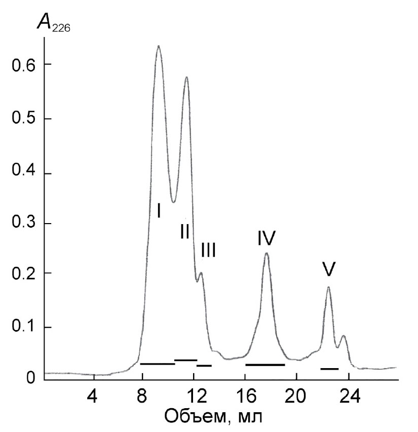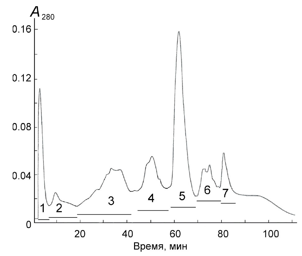 Выделение белка. Яд растворяли в 0.1 М ацетате аммония (рН 6.2) и наносили на колонку с Superdex 75 (10 × 300 мм; Cytiva, США), уравновешенную тем же буфером. Элюцию проводили при скорости потока 1.0 мл/мин. Оптическую плотность элюента регистрировали при 226 нм. Фракцию I (рис. 1) лиофилизировали и далее разделяли методом анионообменной хроматографии на колонке MonoQ 4.6/100 PE (4.6 × 100 мм; Cytiva, США). Буфер А – 50 мМ этаноламина гидрохлорид (рН 9.5), буфер Б – он же с 1 М NaCl. Градиент 5–55% буфера Б за 100 мин, скорость потока 0.5 мл/мин, детекция выхода фракций при длине волны 280 нм (рис. 2).