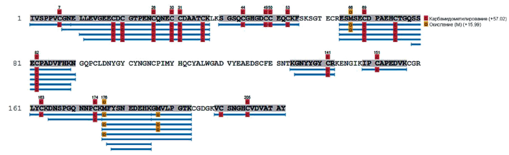 Для характеристики аминокислотной последовательности белок восстанавливали с помощью трис(2-карбоксиэтил)фосфина, карбамидометилировали 2-хлорацетамидом, гидролизовали трипсином и анализировали полученные пептиды методом жидкостной хроматографии с тандемной массспектрометрией (рис. 4). Проведенный анализ показал, что выделенный нами белок гомологичен белкам, включающим дизинтегриноподобный и богатый остатками цистеина домены металлопротеиназ типа III из ядов змей. В частности, он имеет 68% идентичных аминокислотных остатков с белком халисетином (halysetin, VM3H_GLOHA) [17] из яда Agkistrodon (Gloydius) halys (рис. 4). Выделенный нами белок назван глосаксин (от англ. glosaxin – GLOydiys SAXatlis disintegrIN-like protein).