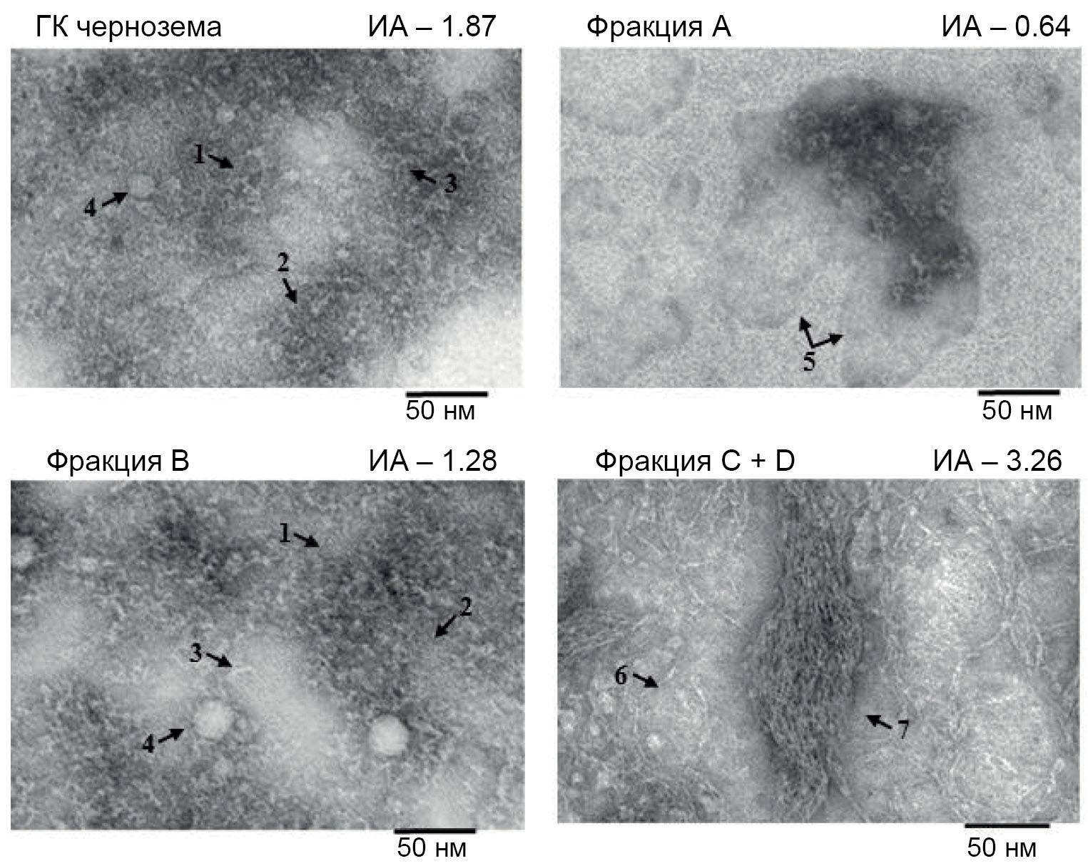 Рис. 2. ПЭМ-изображения препаратов ГК чернозема и фракций А, В, C + D. Номера 1–7 соответствуют порядковым номерам морфологических форм, представленных в табл. 2: точечные частицы (1), кольцевые частицы (2), червеподобные частицы (3), сфероиды (4), капельные везикулоподобные образования (5), длинные фибриллы (6), пучки длинных фибрилл (7). Индекс ароматичности (ИА), т.е. Саром/Салиф, рассчитан на основании 13С-ЯМР-спектров по соотношению площадей над областями химических сдвигов ароматического (165–108 м.д.) и алифатического (108–0 м.д.) углерода согласно нашим ранее опубликованным данным [32].