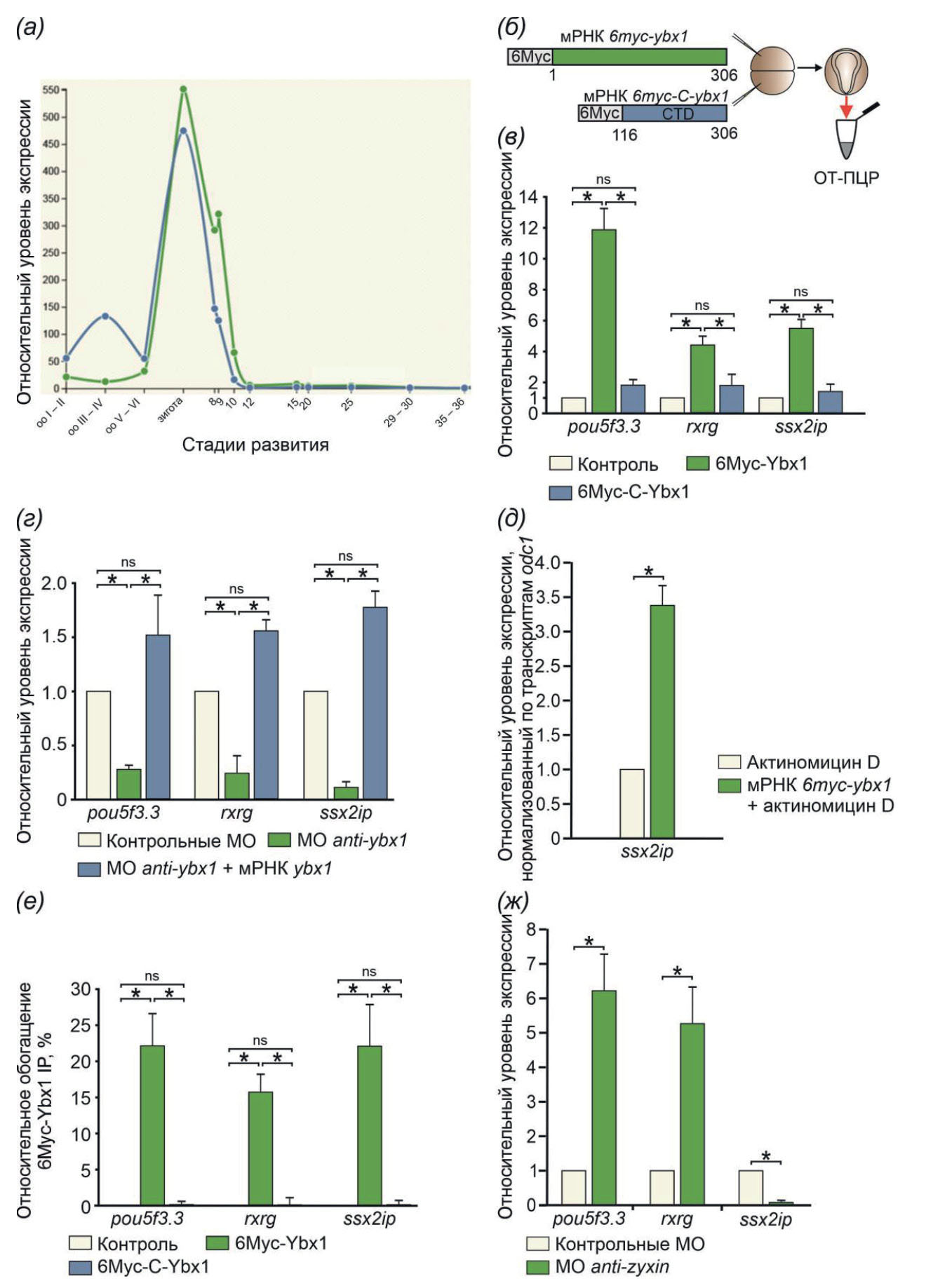 Рис. 1. (а) – Профиль экспрессии материнского гена ssx2ip (L-гомолог – зеленый, S-гомолог – синий) по стадиям развития лягушки X. laevis (по Xenbase); (б) – схема эксперимента по микроинъекциям в эмбрионы X. laevis; (в) – влияние экзогенных белков 6Myc-Ybx1 и 6Myc-C-Ybx1 на уровень мРНК гена ssx2ip в сравнении с ранее обнаруженными [17, 18] генами pou5f3.3 и rxrg, выявленное методом ОТ-ПЦР (* р < 0.05, ns – статистически незначимо); (г) – влияние подавления трансляции морфолиновыми олигонуклеотидами (МО) мРНК ybx1 на количество мРНК материнских генов pou5f3.3, rxrg, ssx2ip и восстановление нормального уровня этих транскриптов инъекцией синтетической РНК 6myc-ybx1, выявленное методом ОТ-ПЦР (* р < 0.01, ns – статистически незначимо); (д) – уровень мРНК ssx2ip в ответ на микроинъекции синтетической мРНК 6myc-ybx1 в условиях блокирования транскрипции актиномицином D, выявленное методом ОТ-ПЦР (* р < 0.05, ns – статистически незначимо). Для нормализации данных использовали ОТ-ПЦР c мРНК гена домашнего хозяйства odc1. Все вышеприведенные данные, выявленные методом ОТ-ПЦР, представлены в виде кратного изменения экспрессии генов в опытных эмбрионах по сравнению с экспрессией в контрольных эмбрионах. Во всех случаях для нормализации данных использовали гены odc1 и eef1a1, показаны стандартные отклонения, полученные в результате трех независимых экспериментов; (е) – результаты РНК-иммунопреципитации: осаждение факторами 6Myc-Ybx1 и 6Myc-C-Ybx1 мРНК ssx2ip в сравнении с ранее изученными мРНК rxrg и pou5f3.3 [17, 18] (* р < 0.01, ns – статистически незначимо). В качестве контроля использовали смолу с антителами анти-Flag. Данные представлены в виде процентного соотношения связавшихся мРНК к общему количеству данной мРНК в лизате. Во всех случаях показаны стандартные отклонения, полученные в результате трех независимых экспериментов; (ж) – эффект от подавления трансляции мРНК цитоскелетного белка зиксина морфолиновыми олигонуклеотидами (* р < 0.05, ns – статистически незначимо). Количество мРНК ssx2ip уменьшается, в то время как уровень мРНК генов pou5f3.3 и rxrg возрастает в ответ на нокдаун гена zyxin.