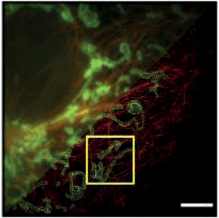 Рис. 8. Возможности многоцветной высокоскоростной SIM. Поле зрения 33 × 33 мкм, микротрубочки показаны красным, митохондрии – зеленым. Масштабный отрезок 5 мкм [85].