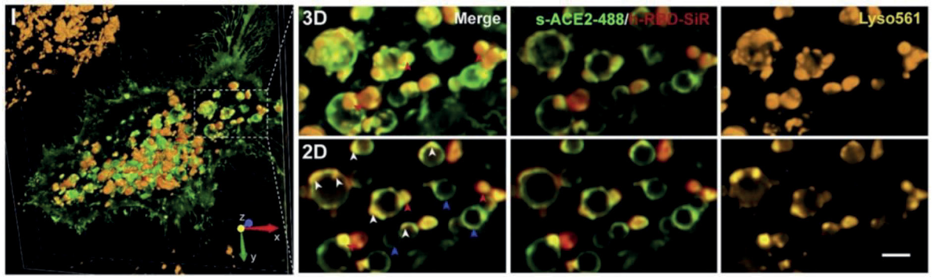 В работе Miao et al. [92] благодаря 2D- и 3D-SIM-визуализации (рис. 9) были выявлены места назначения белков рецептор-связывающего домена (RBD, receptor-binding domain) SARS-CoV-2 (severe acute respiratory syndrome-related coronavirus 2) и ангиотензин-превращающего фермента 2 (ACE2, Angiotensin-converting enzyme 2), а также движение и созревание солокализованных везикул ACE2/RBD в живых клетках, движение везикул по микротрубочкам. В результате было показано, что инфицирующие вирусные RBD и, возможно, другие капсидные белки в конечном итоге захватываются и расщепляются лизосомами, даже если вирусная РНК стимулирует образование нового вируса.
