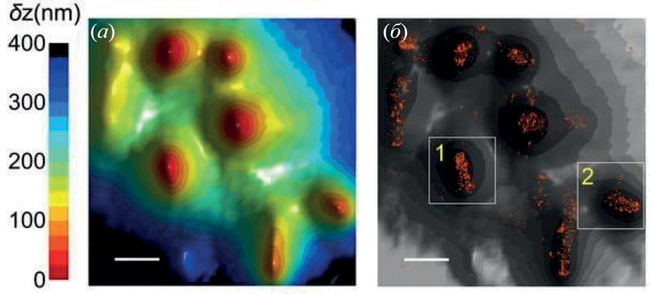 Рис. 10. Локализация L-селектина и CD44 на трехмерной топографии поверхности Т-клеток. (a) – Трехмерная реконструкция поверхности покоящейся мембраны Т-клеток человека с использованием MA-TIRFM; (б) – карта локализации молекул L-селектина (оранжевые точки), наложенная на карту реконструкции 3D-поверхности из панели (a). Масштабный отрезок 0.5 мкм [105].