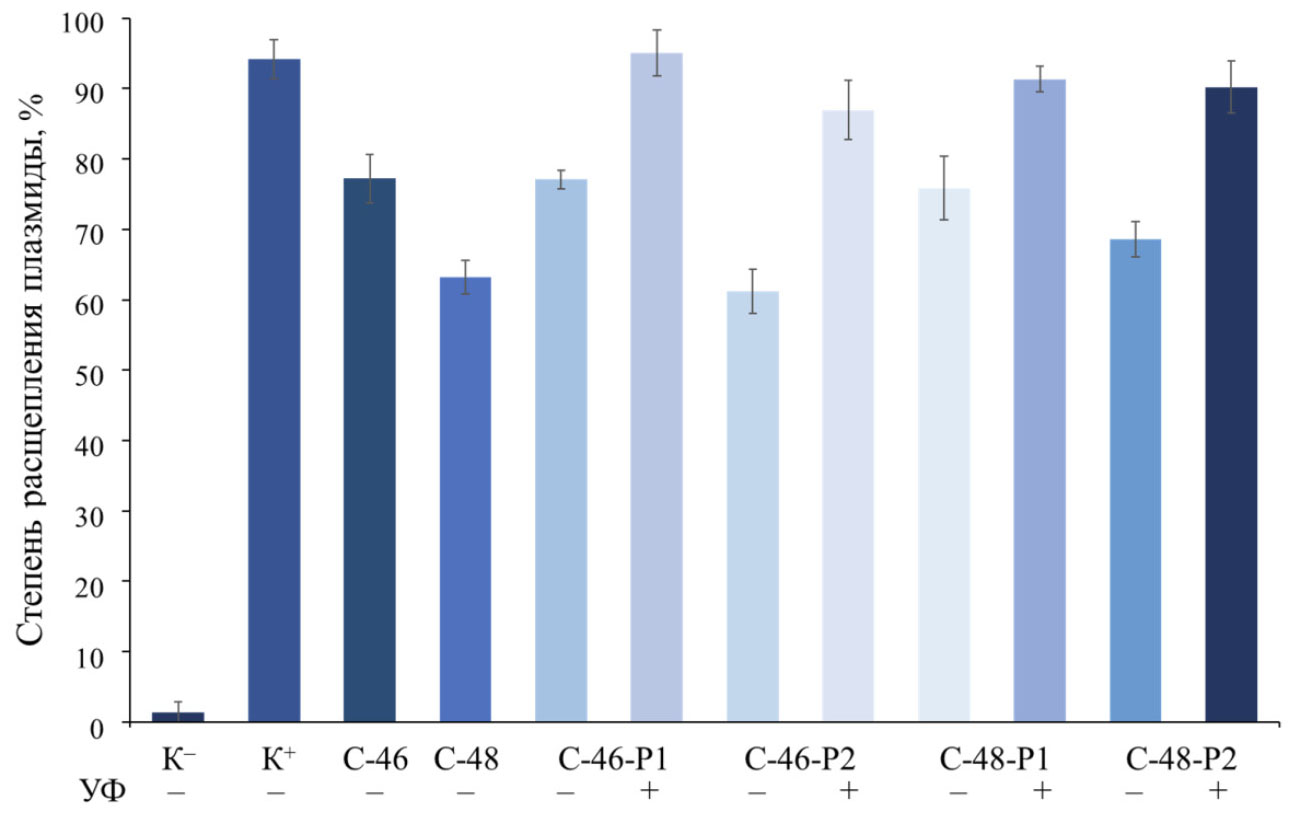 Реакционные смеси анализировали в 1%-ном агарозном геле с окрашиванием бромистым этидием. После облучения циклических фотомодифицированных crРНК регистрировали повышение степени расщепления модельной плазмиды (рис. 6). В присутствии необлученных циклических crРНК (С-46 и С-48) нуклеаза Cas9 была способна расщеплять ДНК-мишени, но глубина реакции при этом была значительно ниже, чем в присутствии контрольной линейной crРНК.