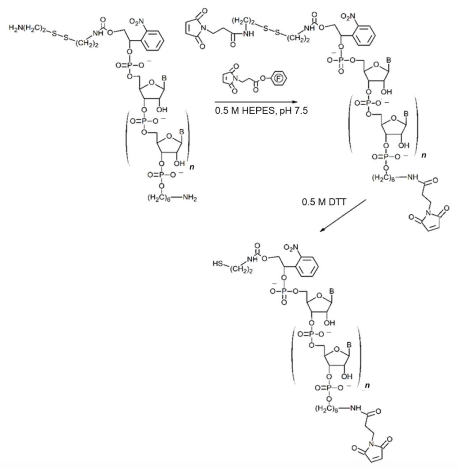 Затем дисульфидную связь восстанавливали с образованием сульфгидрильной группы (–SH) путем обработки 0.5 М раствором дитиотреитола (DTT). В результате получали олигорибонуклеотид, который содержал SH-группу на 5′-конце и малеимидную группу на 3′-конце. Реакционную смесь использовали для циклизации без проведения дополнительной очистки, т.к. в ней присутствовал единственный основной продукт реакции.