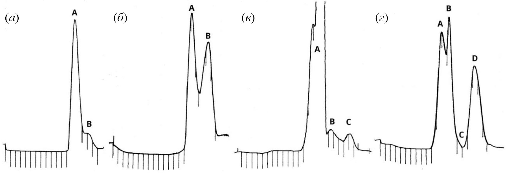 Рис. 1. Хроматограммы стадий процесса гель-фильтрации смеси пептида (I) и низкомолекулярных примесей, вертикальные линии соответствуют промежутку времени 2 мин. (а) – Сорбент Sephadex G-10, отсутствие разделения при нанесении необработанной смеси; (б) – Sephadex G-10, частичное разделение после отгонки значительной части солей с водяным паром перед нанесением; (в) – сорбент Sephadex LH-20, частичное разделение при нанесении необработанной смеси; (г) – сорбент Sephadex LH-20, практически полное разделение после отгонки значительной части солей с водяным паром в ходе лиофилизации перед нанесением.