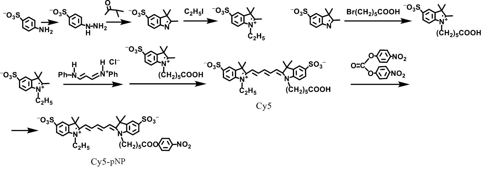 Рис. 2. Схема синтеза флуоресцентного красителя Cy5 и активированного производного пара-нитрофенилового эфира красителя Cy5-pNP.