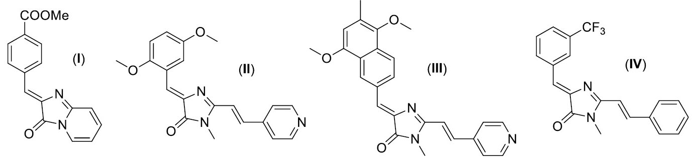 Флуорогены – вещества, не обладающие собственной флуоресценцией в водных растворах, но приобретающие ее при их связывании с определенными целевыми молекулами (белками [1–4], нуклеиновыми кислотами [5] и др. [6–9]). Такая особенность позволяет в существенной степени сократить нецелевое мечение и фоновый сигнал, что делает флуорогены интереснейшим инструментом для использования во флуоресцентной микроскопии. Отдельного упоминания заслуживают флуорогены, основанные на арилиден-имидазолонах, чья структура аналогична структуре зрелого хромофора GFP [10]. Вещества данного типа характеризуются небольшим размером, обладают различными спектральными свойствами, высокой растворимостью в воде, кроме того, их несложно синтезировать [11]. Многие арилиден-имидазолоны демонстрируют значительное увеличение интенсивности флуоресценции при переходе из водной среды в менее полярный растворитель, что делает их потенциальными флуоресцентными “сенсорами полярности”. Благодаря такому свойству на основе арилиден-имидазолонов были созданы флуорогенные красители (I), (II) [12], (III) [13] и (IV) [14], пригодные для селективного флуоресцентного окрашивания эндоплазматического ретикулума (ЭПР).