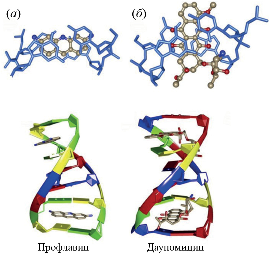 Рис. 1. Визуализация параллельной (а) или перпендикулярной (б) интеркаляции по отношению к парам азотистых оснований ДНК (голубой цвет) [12].