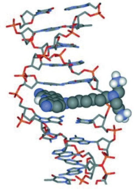 Интеркаляция ДНК вызывает локальные структурные возмущения в спирали ДНК, в основном частичное раскручивание спирали, что приводит к удлинению ДНК [10]. Эти структурные модификации приводят к прерыванию репликации, транскрипции и репарации ДНК, препятствуя связыванию ДНК с ассоциированными белками, такими как полимеразы, транскрипционные факторы и топоизомеразы [11].
