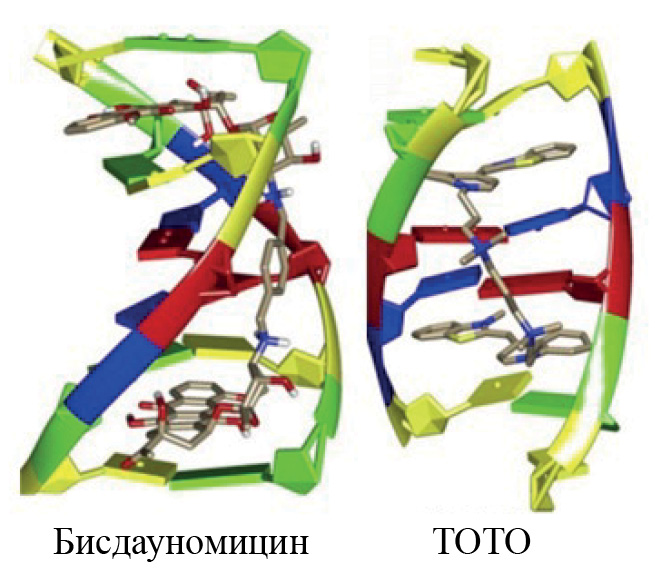 Рис. 3. 3D-изображение интеркаляционных комплексов ДНК с бисинтеркалятами: бисдауномицином и ТОТО [12].