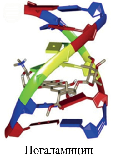 Рис. 4. 3D-изображение интеркаляционных комплексов ДНК с ногаламицином. Реализуется дополнительное связывание периферийных заместителей с фрагментами малой и большой бороздки [12].