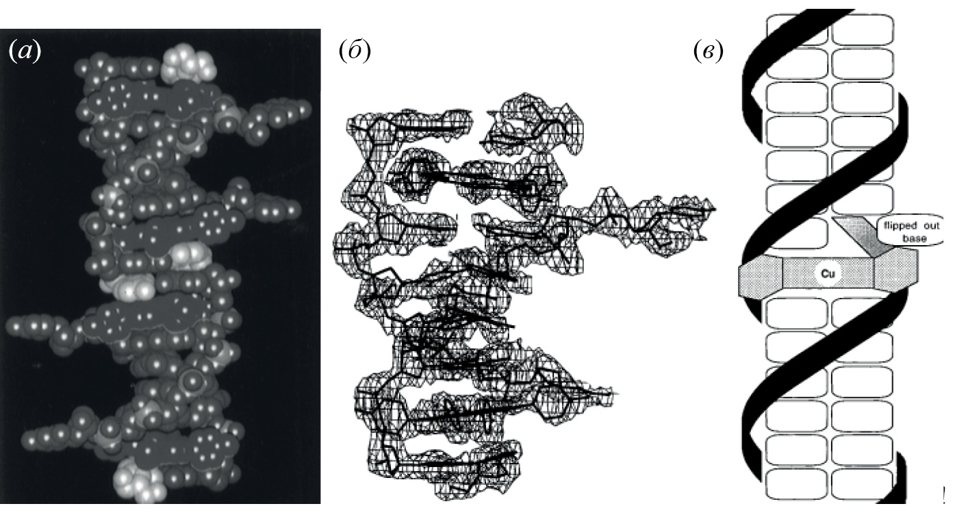 Подобное нарушение одной из спиралей дуплекса, где одно из оснований оказывается вывернутым, наблюдалось и в работах [61, 62]. Согласно рентгеноструктурным данным, интеркаляция порфиринов и [Ru(bpy)2dppz]2+ (bpy = 2,2'-бипиридин и dppz = дипиридофеназин) также может вызывать выворачивание азотистого основания нуклеиновой кислоты из стекинга.