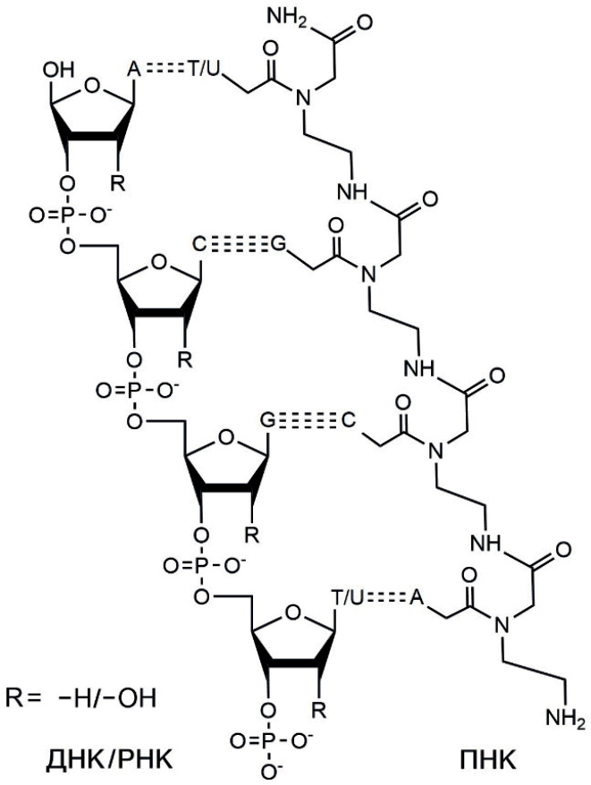 Для разработки эффективных антибактериальных лекарственных препаратов в работах изучаются конъюгаты В12 с пептидно-нуклеиновыми кислотами (ПНК) [34]. ПНК представляют собой олигомерные молекулы, в которых азотистые основания соединены с остовом (рис. 3) – пептидной незаряженной ахиральной структурой, не содержащей пентоз и остатков фосфорной кислоты. В связи с особенностью своего строения ПНК – это в некотором смысле аналоги нуклеиновых кислот, что обусловливает их способность образовывать устойчивые дуплексы ПНК–ПНК, ПНК–ДНК и ПНК–РНК, а также триплексы (ПНК)2(ДНК). При этом, в отличие от нуклеиновых кислот, ПНК исключительно чувствительны к наличию некомплементарных пар в структуре ДНК или РНК [35].