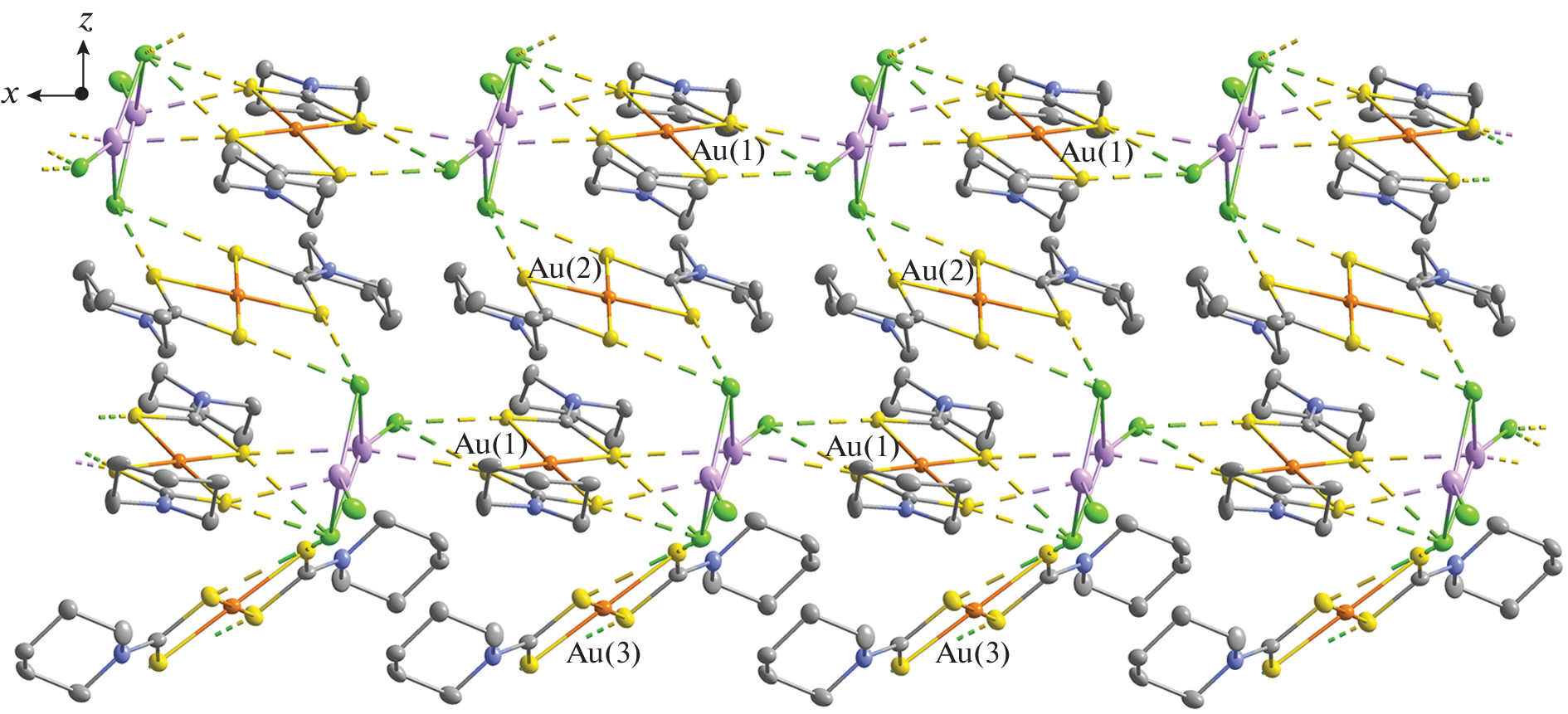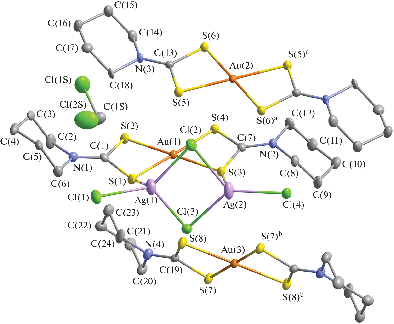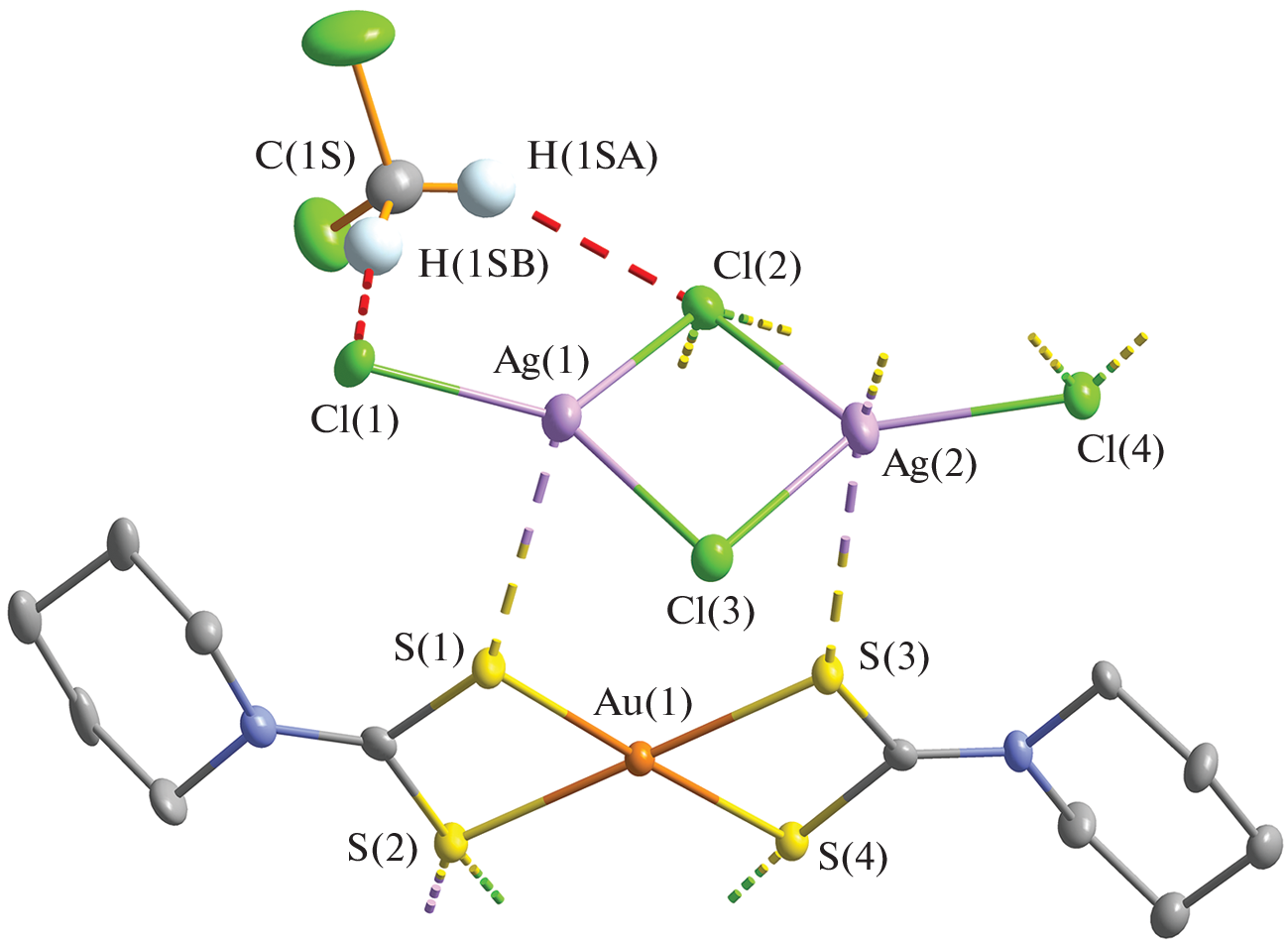 The double Au(III)–Ag(I) complex crystallizing as the solvated form of [Au{S2CN(CH2)5}2]2[Ag2Cl4]· CH2Cl2 (I) was obtained by the reaction of silver(I) N,N-pentamethylenedithiocarbamate with a solution of Na[AuCl4]/5.15 M NaCl. According to X-ray diffraction data (CIF file CCDC no. 2062810), the structural units of the compound are nonequivalent [Au{S2CN(CH2)5}2]+ cations (noncentrosymmetric A and centrosymmetric B and C in a ratio of 2 : 1 : 1), cyclic tetrachlorodiargentate(I) anions, [Ag2Cl4]2–, and solvating CH2Cl2 molecule. The latter is retained in the structure due to two nonequivalent C–H···Cl hydrogen bonds formed with the cyclic [Ag2Cl4]2– anion involving its terminal Cl(1) and bridging Cl(2) chlorine atoms. The supramolecular self-organization of I is based on a system of multiple Ag···S and Cl···S secondary interactions that сombine the ionic structural units of the complex into an intricate two-dimensional pseudopolymer layer. A study of the thermal behavior of I by simultaneous thermal analysis established the conditions for quantitative reduction of bound gold(III) and silver(I). The studied Au(III)–Ag(I) compound exhibits a high level of biological activity against the nonpathogenic M. smegmatis strain.