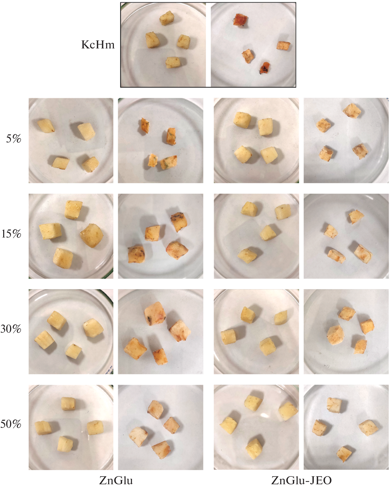 Biocompatible metal-organic framework [Zn4(GA)4(H2O)4]·4H2O (H2GA is glutamic acid) is tested as a “container” with bioactive hydrophobic components of jasmine essential oil for the preparation of functional composite materials based on a hydrocolloid matrix containing kappa-carrageenan and hydroxypropyl methylcellulose. The prepared composite film coatings exhibit high antimicrobial and antioxidant activities in the model experiment with a long-term storage of fruits, which indicates broad prospects for the practical use of these materials as an active packing of food products.