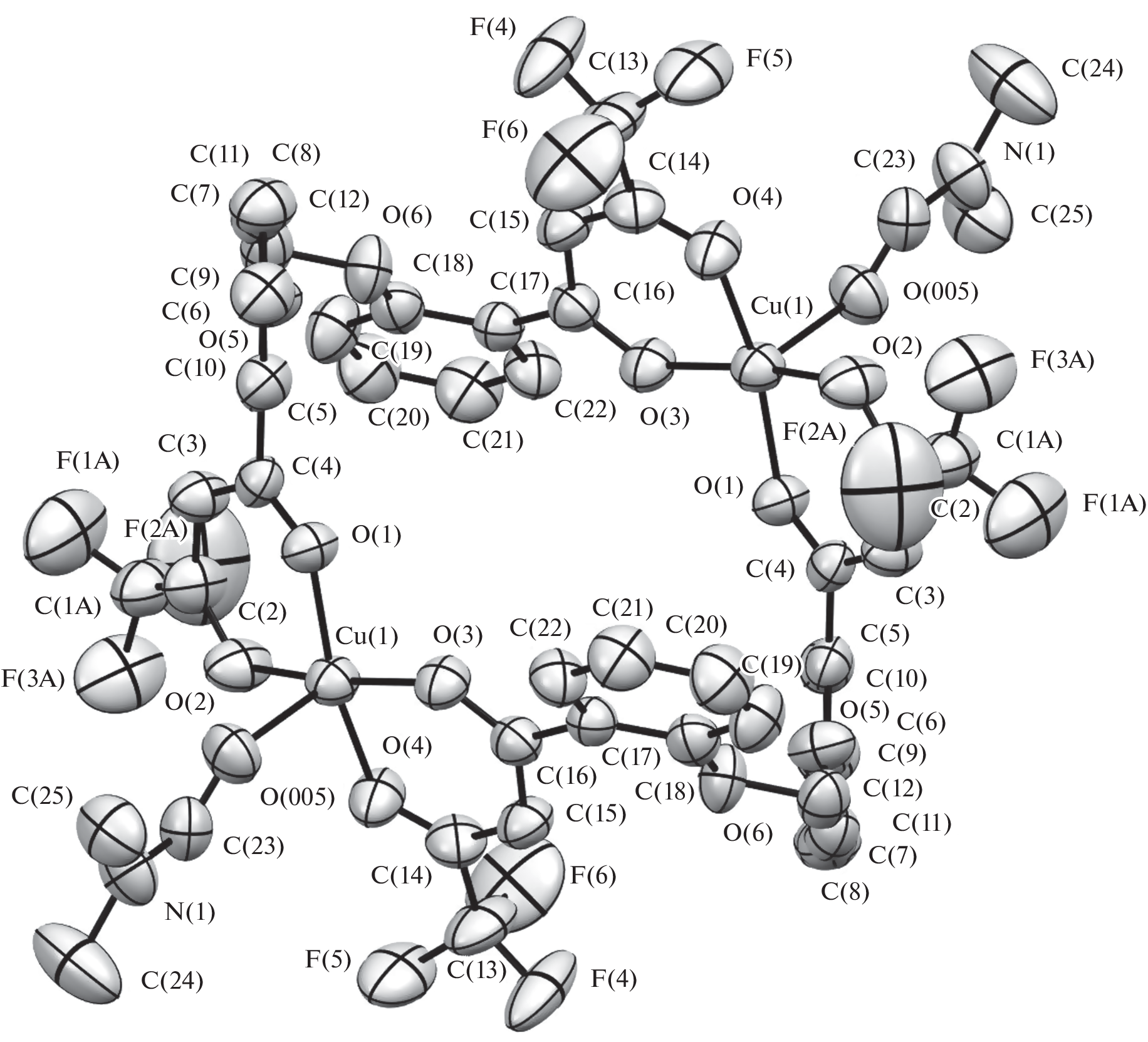New binuclear complex 1,2-bis[2-(4,4,4-trifluoro-1-hydroxy-3-oxobut-1-enyl)phenoxy]ethanedi(dimethylformamide)dicopper(II) is synthesized, and its structure is studied by X-ray diffraction (XRD) (CIF file CCDC no. 2179252). A crystal of the complex is formed by centrosymmetric Cu2L2(DMF)2 molecules in which the coordination environment of each metallocenter is a distorted square pyramid, and the whole molecule is a metallomacrocycle containing the calixarene-like cavity. Its size is determined the distance between the Cu…Cu metallocenters (7.699 Å) and the distance between the planes of the opposite phenyl radicals in the cis position (8.200–8.323 Å). The cavity is a parallelogram. The carcass-type binuclear structure is formed due to an increase in the denticity of the ligand via the formation of the bis(triketone)-like structure that weakens the donor character of both functional groups of the β-diketone fragment.