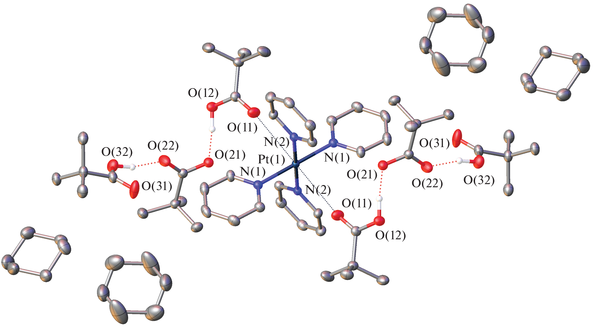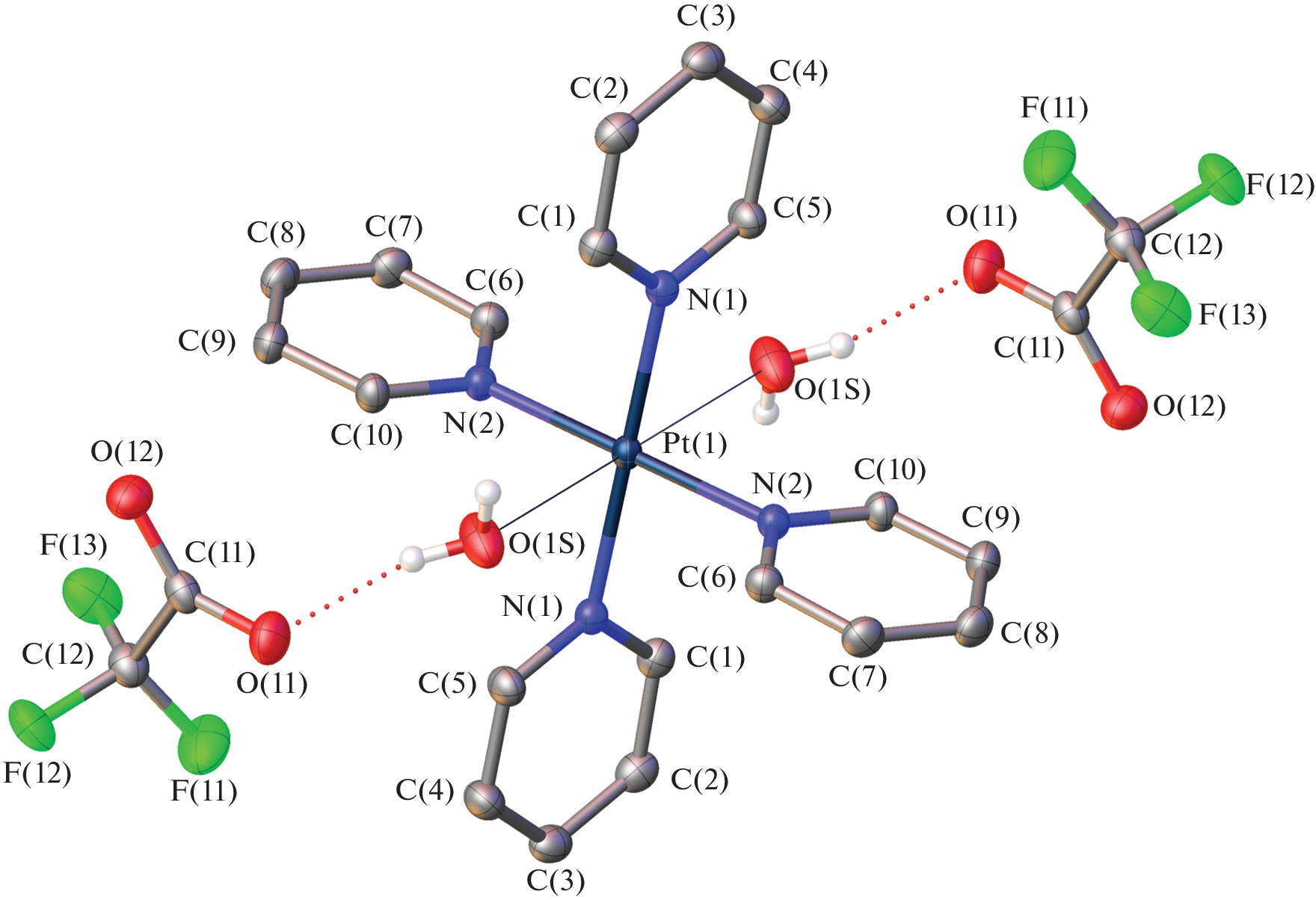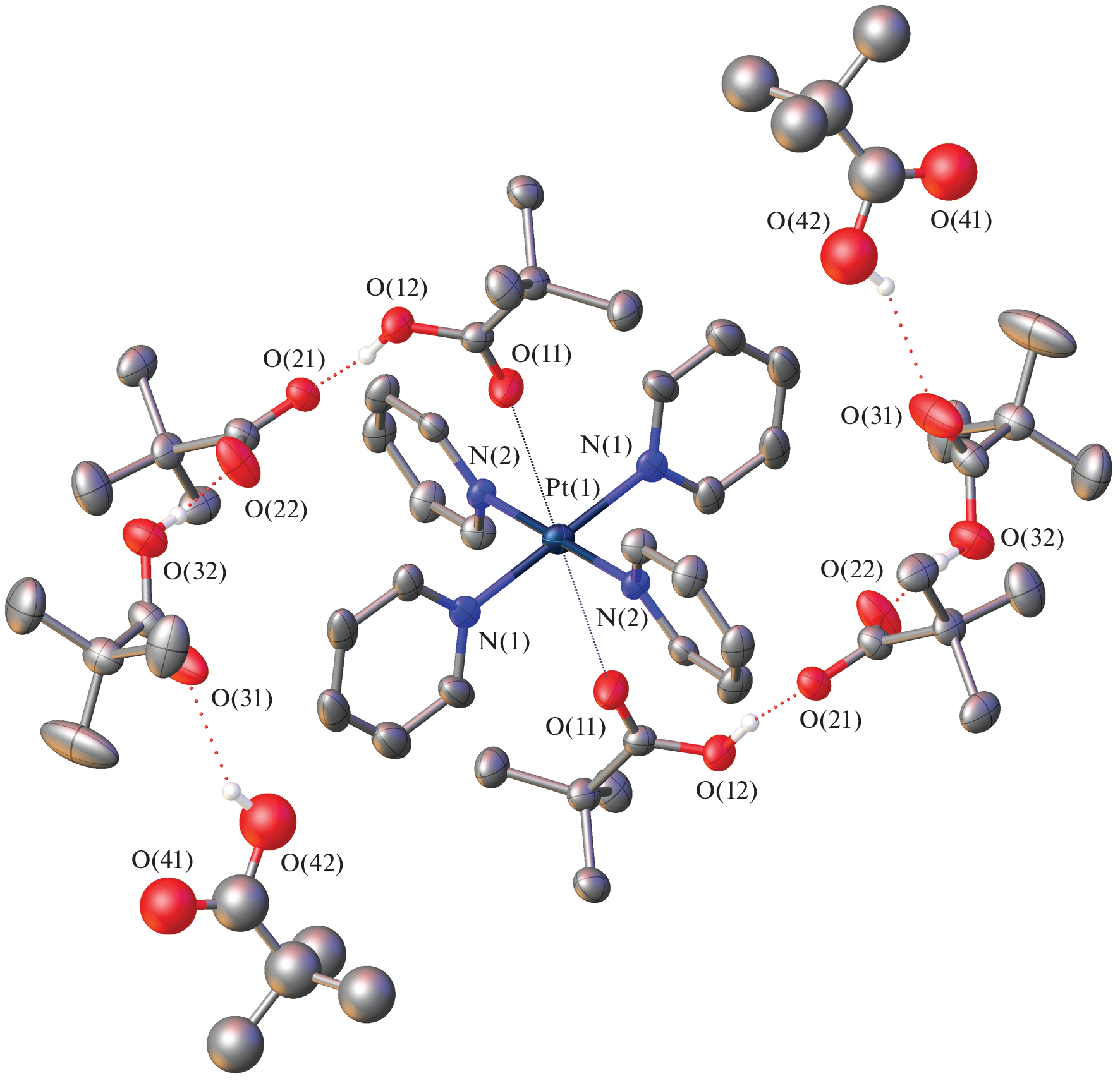 A series of mono- and bimetallic cation-anionic complexes based on the [PtPy4]2+ cation with different single-charge anions of carboxylic acids (RCOO–) is synthesized and structurally characterized. A synthetic approach to the preparation of tetrapyridineplatinum complexes [PtPy4]2+ soluble in polar solvents from available reagents is developed. The reaction of tetrapyridineplatinum dichloride [PtPy4](Cl)2 with silver acetate or trifluoroacetate affords compounds [PtPy4](OOCMe)2·6H2O (I) and [PtPy4](OOCCF3)2· 2H2O (II) in the form of crystalline hydrates (CIF files CCDC nos. 2161100 and 2161101, respectively) in high yields. Other carboxylates can be prepared by the treatment of compound I with an excess of a stronger acid, for example, trifluoroacetic acid, with the formation of the corresponding complex trifluoroacetate [PtPy4](OOCCF3)2·4CF3COOH (IIa) (CIF file CCDC no. 2161102). Another method consists of the displacement of acetic acid with an excess of a lowly volatile acid, for example, pivalic acid, when [PtPy4](Piv)2· 5HPiv (III) is formed from the acid melt, and solvatomorph [PtPy4](Piv)2·4HPiv·3C6H12 (IIIa) (CIF files CCDC nos. 2161103 and 2161104, respectively) is formed in a cyclohexane medium. Heteroanionic heterometallic complex [PtPy4](OOCFc)(OOCMe) (IV) (CIF file CCDC no. 2161105) is shown to be formed by the reaction of complex I with ferrocenecarboxylic acid under mild conditions.