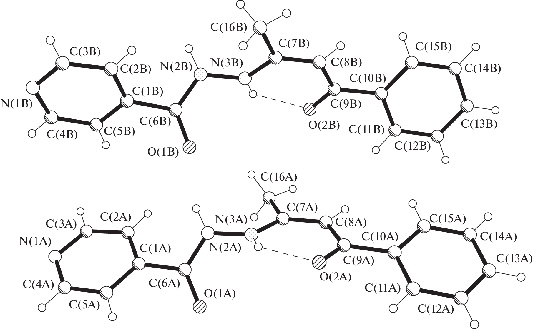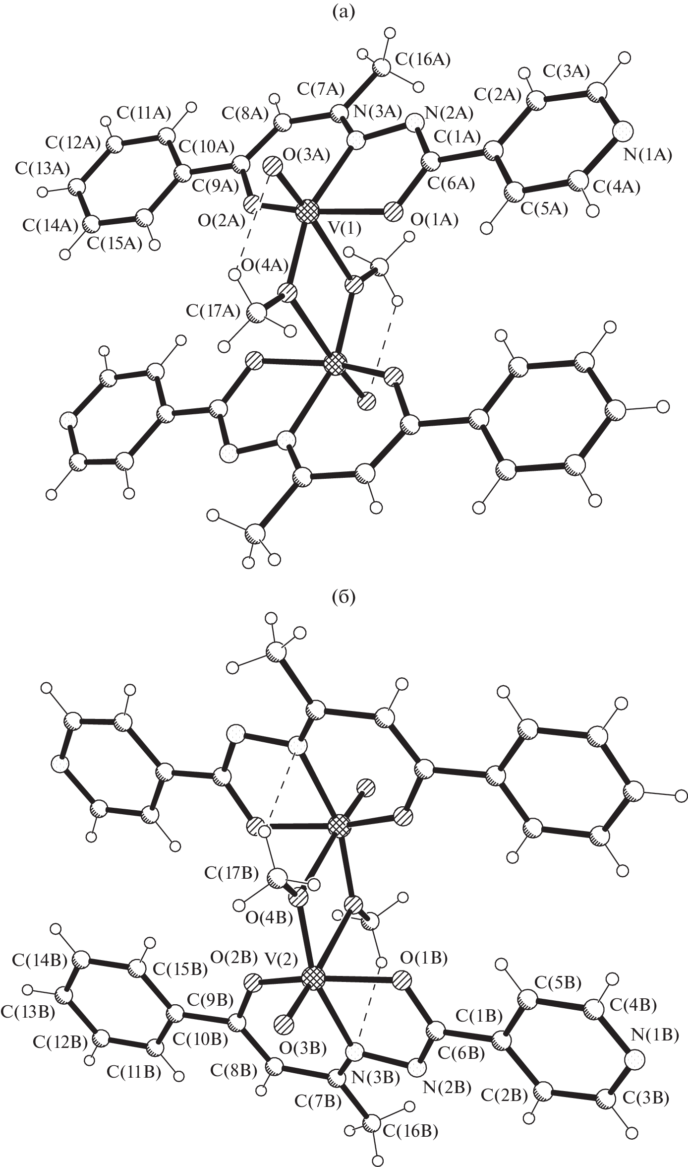 Синтезирован новый молекулярный двухъядерный комплекc ванадия(V) [VO(L)(OCH3)]2 (I), в котором H2L был получен в результате взаимодействия гидразида изоникотиновой кислоты (изониазид) с 1-фенил-1,3-бутандионом. Лиганд H2L и комплекс I исследованы методами элементного анализа, ИК-спектроскопией, масс-спектрометрией и рентгеноструктурного анализа (CCDC № 2172124 и 2172125 соответственно), состав и строение лиганда в свободном состоянии дополнительно исследованы методом ЯМР-спектроскопии. Установлено, что бидепротонированный органический лиганд L2– координируется к атому металла тридентатно через набор донорных атомов ONO с образованием двух сочлененных металлоциклов. При этом в H2L и в соответственном координированном лиганде стабилизированы различные таутомерные формы.