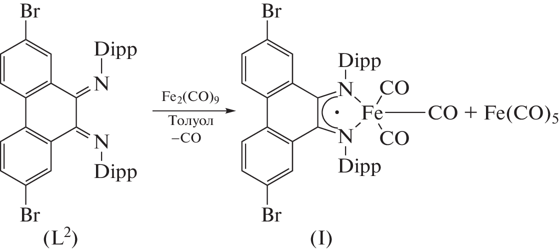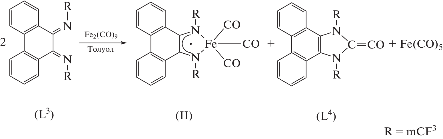 The oxidative addition of N,N'-disubstituted phenanthrenediimines to iron carbonyls was studied. The reactions of acceptor phenanthrenediimines with Fe2(CO)9 give iron(I) tricarbonyl complexes with anion-radical forms of the ligands. The synthesized compounds were characterized by NMR and IR spectroscopy. The structures of the complex based on N,N'-bis(3-trifluoromethylphenyl)phenanthrenediimine and imidazol-2-one ligand was established by X-ray diffraction (XRD) (CIF files СCDC nos. 2173471 and 2173472, respectively).