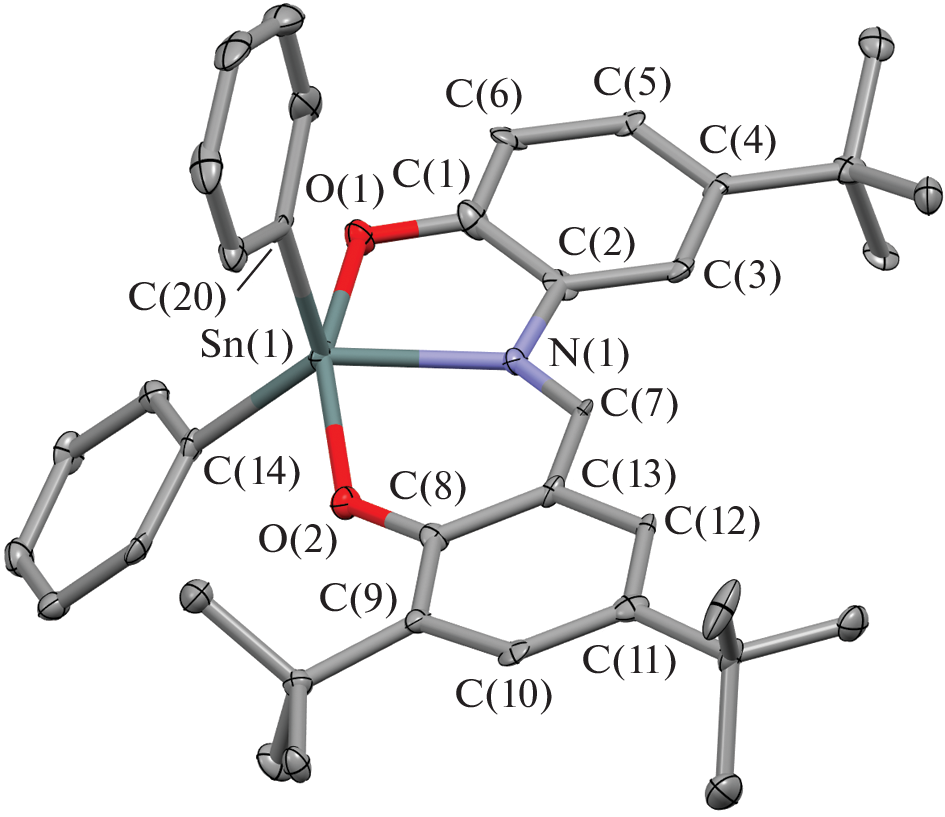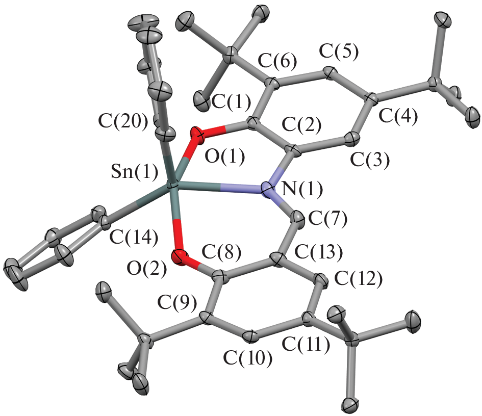 New tin(IV) complexes with O,N,O'-donor Schiff bases (L1H2–L4H2) of the (Ln)SnR2 type (R = Ph (I–III), Et (IV–VII)) are synthesized and characterized. The molecular structures of compounds I–III, VI, and VII in the crystalline form are determined by X-ray diffraction (XRD) (CIF files CCDC nos. 2181140 (I), 2181142 (II), 2181143 (III∙CH3CN), 2181141 (VI), and 2181139 (VII)). Tin complexes I–III and VI are mononuclear pentacoordinate compounds. Crystalline complex VII forms dimers via the pairwise bridging coupling between the oxygen and tin atoms of the mononuclear fragments. The redox-active ligand in the synthesized compounds exists as the iminobis(phenolate) dianion. The electrochemical properties of free ligands and complexes I–VII are studied. In the case of compounds I, II, IV, and V with tert-butyl substituents in the redox-active ligand, the formation of relatively stable monocationic and monoanionic species is electrochemically detected for the first time. The presence of the electroactive nitro group results in the destabilization of the oxidized forms of the complexes and induces the appearance of an additional peak in the cathodic range. The energy gaps between the frontier redox orbitals are determined by the electrochemical and spectral methods. The obtained parameters are close and vary in a range of 2.43–2.68 eV.