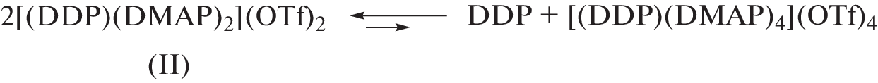The reactions of annulated 1,4-dichloro-3a,6a-diaza-1,4-diphosphapentalenes (DDPCl2) with 1 equiv. of trimethylsilyl triflate (TMSOTf) lead to replacement of one chlorine atom with the triflate group, thus giving cationic diazadiphosphapentalenes [ClDDP]+[TfO]−. In the presence of 2 equiv. of TMSOTf and 2 equiv. of 4‑dimethylaminopyridine (DMAP), the DDP dication stabilized by two DMAP molecules, [DDP(DMAP)2]2+[(CF3SO3)−]2, is formed. The DMAP molecules are located on one side of the DDP skeleton and lie in parallel planes. Free diazadiphosphapentalene was detected in solutions of [DDP(DMAP)2]2+[(CF3SO3)−]2 in CH2Cl2 by UV-Vis spectroscopy and CV. This implies that this compound disproportionates under these conditions; it is unstable in dilute solutions and decomposes to give [DMAP∙HOTf] in a quantitative yield. Crystallographic data for the obtained compounds: CCDC nos. 2182881–2182883.