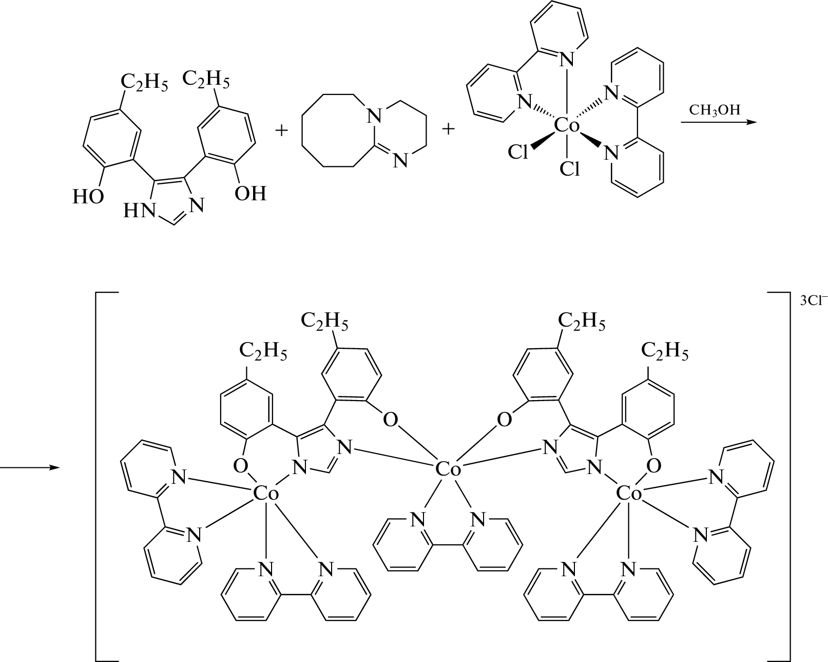 The trinuclear cobalt(III) complex [(Bipy)5Co3(L)2](Cl)3 (I) is synthesized by the template reaction of 2,2'-(1H-imidazole-4,5-diyl)bis(4-ethylphenol) (L) and bis(2,2-bipyridine)cobalt(II) dichloride in the presence of diazabicycloundecene. The complex is isolated in the individual state and characterized by elemental analysis, cyclic voltammetry, UV-VIS spectroscopy, and X-ray diffraction (XRD) (CIF file СCDC no. 2201135). According to the obtained data, the cobalt ions in trinuclear complex I have the oxidation state +3, and the complex formation occurs with the oxidation of the initial cobalt(II) ions.